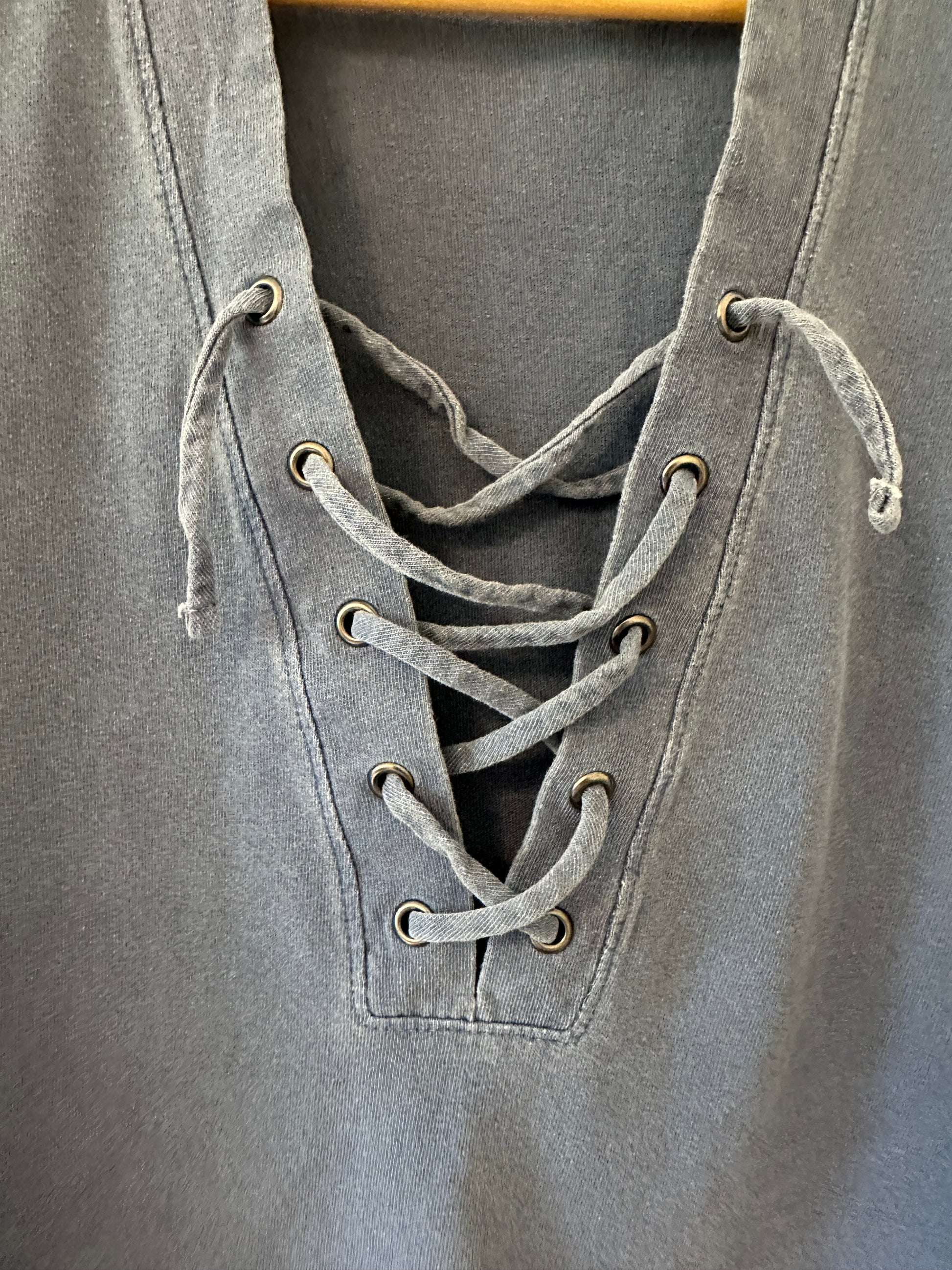 This boxy, cropped tank with a lace up front is about to become a staple in your wardrobe. 100% cotton