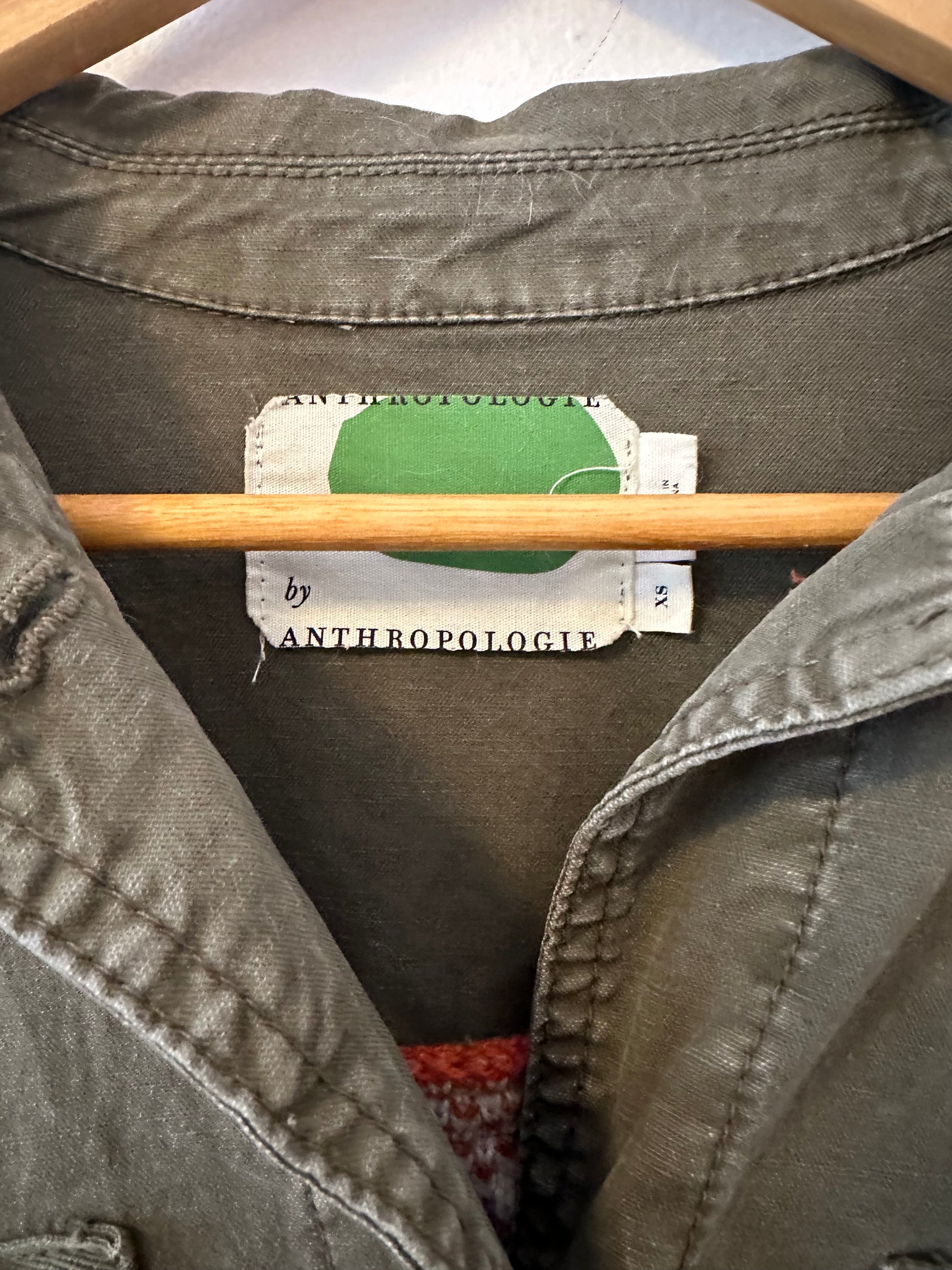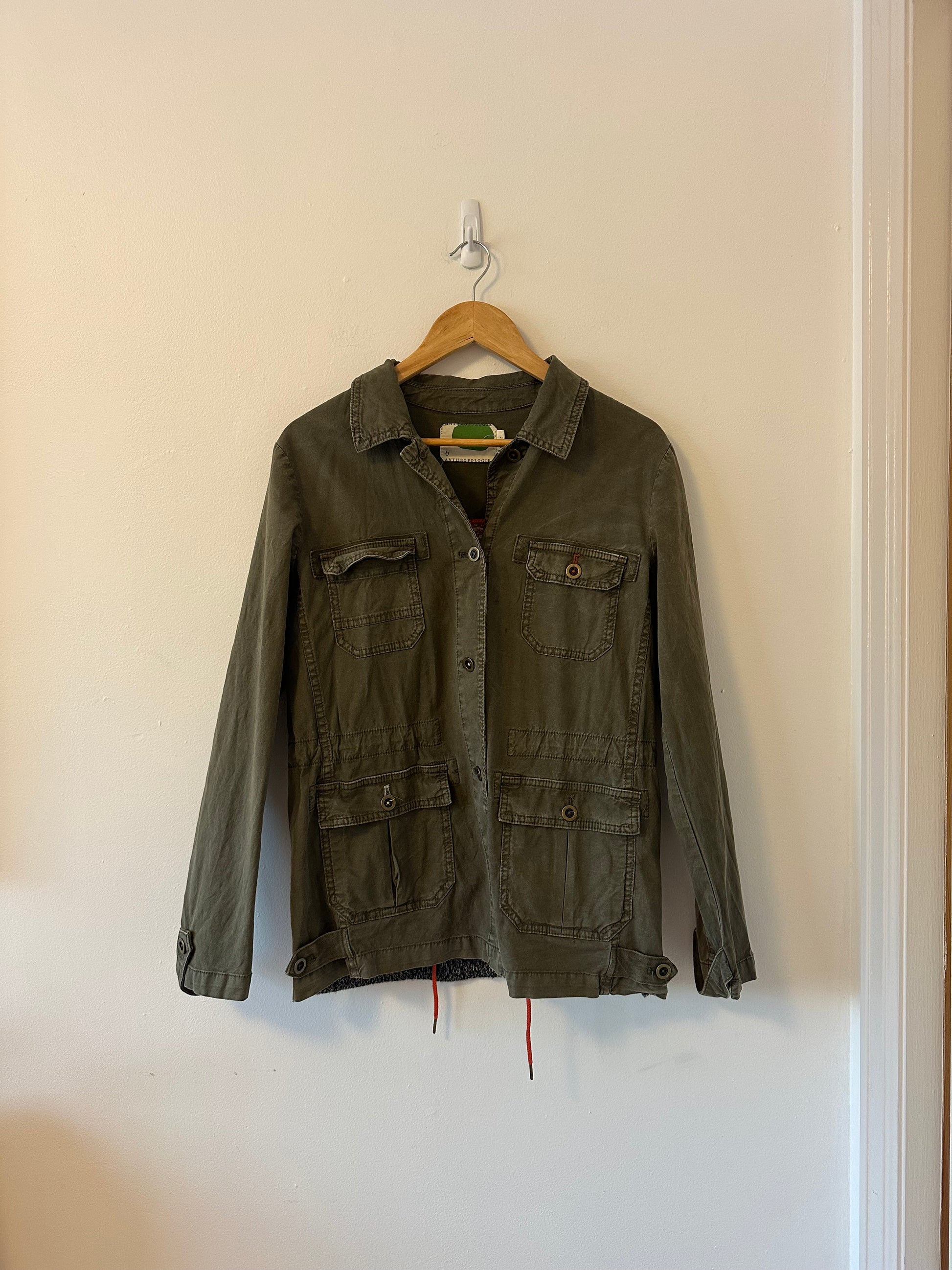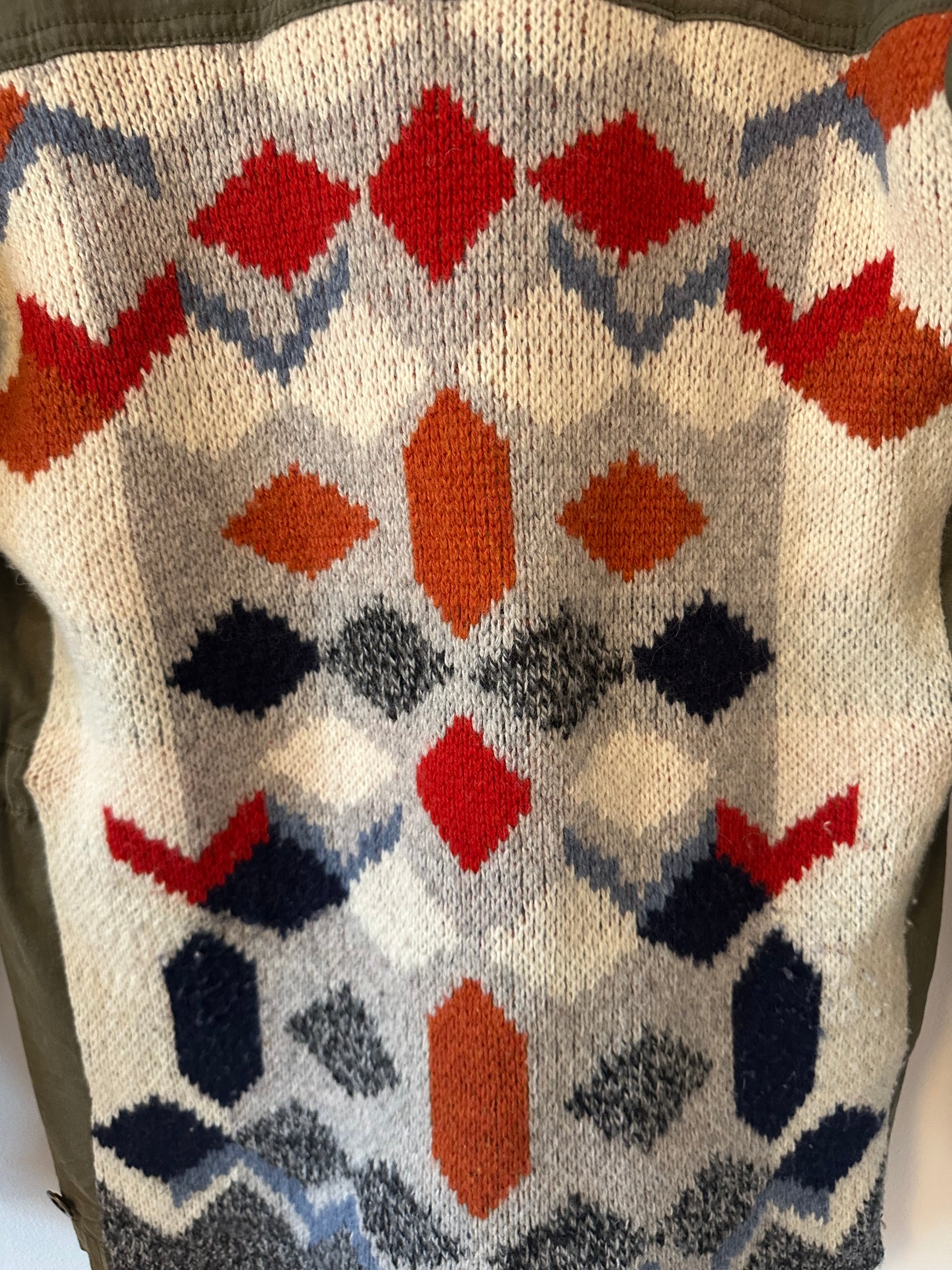 Super fun and unique Anthropologie green canvas button front collared barn jacket/utility jacket with a fun mix- jacquard sweater knit back!
