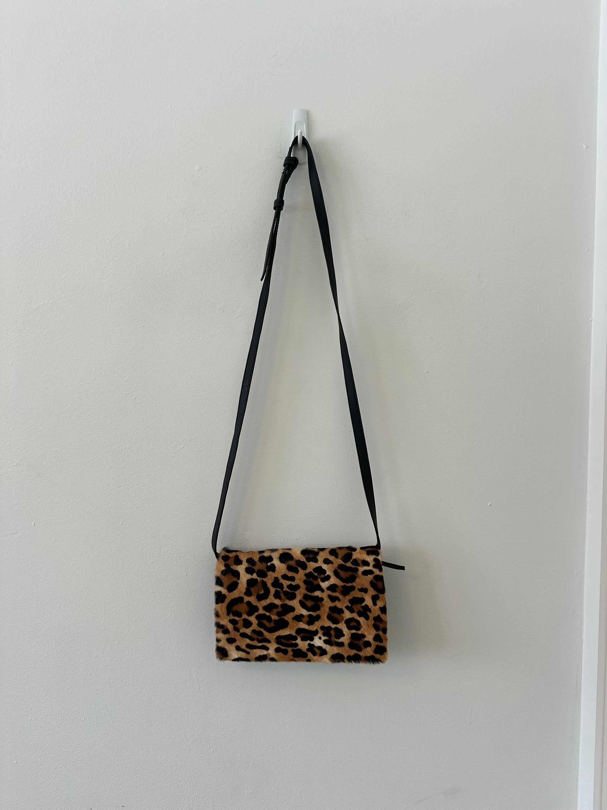 Super cute and fun bag in faux fur leopard print. Black leather accents, including crossbody adjustable shoulder strap. Bag folds over and closes with a snap. Features card holders and many other compartments. Good condition.