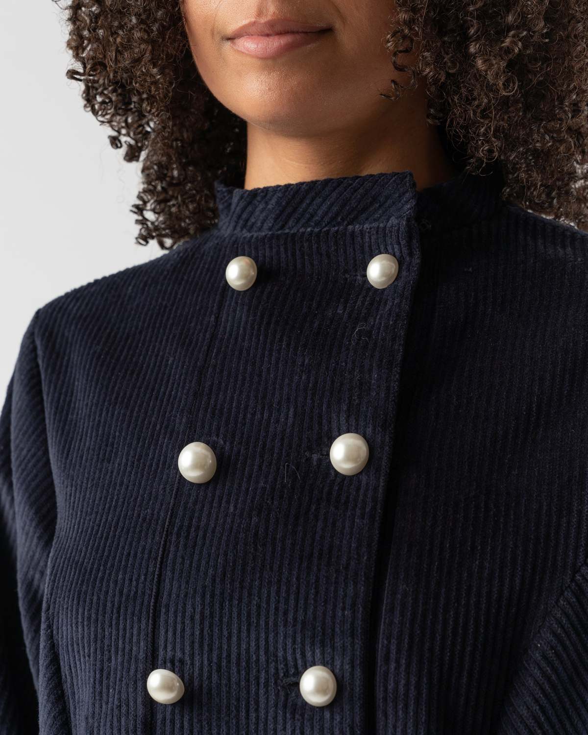 Beray Coat Dress in Navy from Batsheva. Dress in wide-wale Navy Corduroy. Loose fitting shape with flares on the back. Pockets on the sides and pear buttons on the front placket. - True to Size - 100% Cotton - Made in NYC - Dry Clean Only