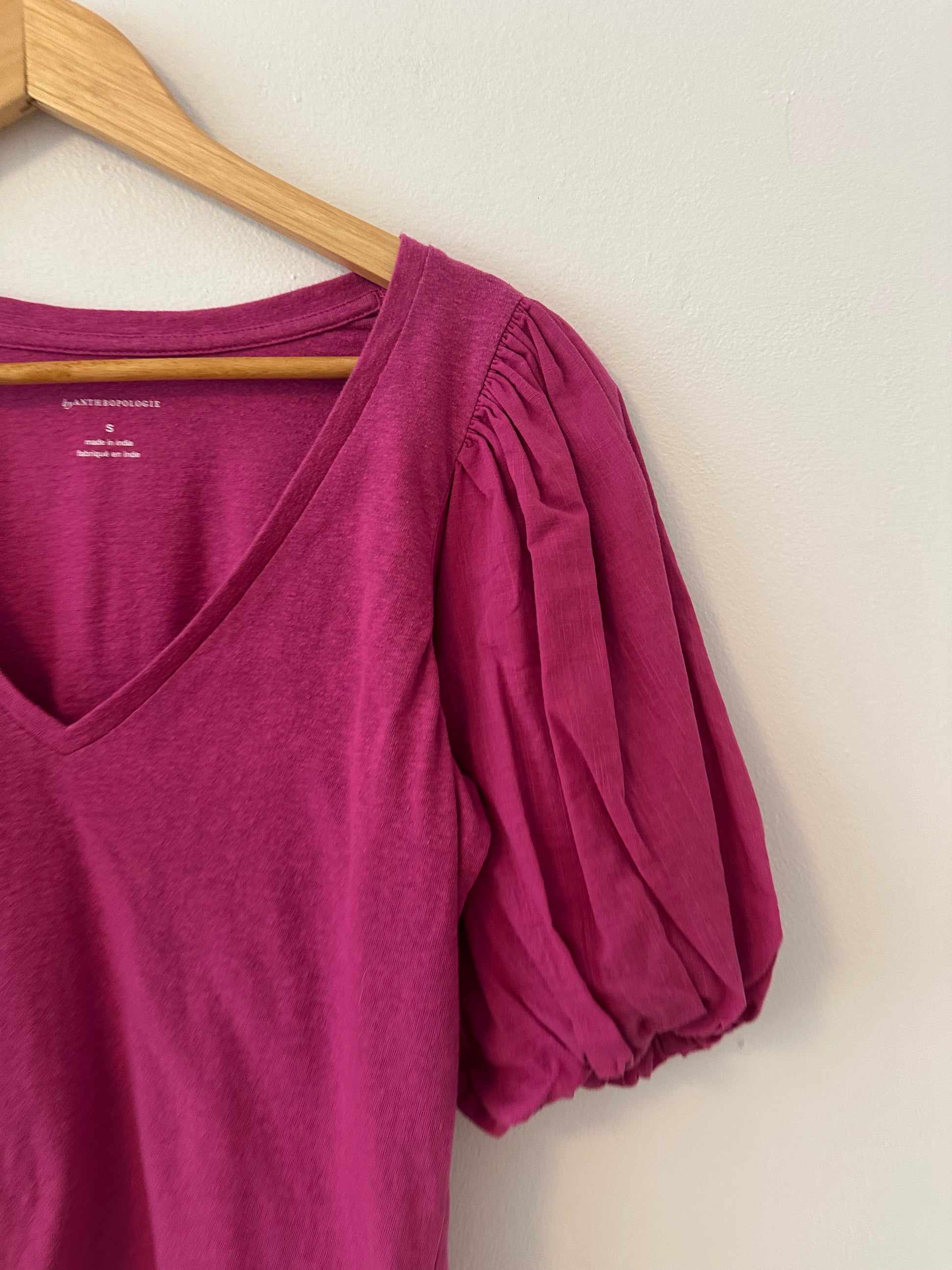 By Anthropologie Pink Puff Sleeve V-Neck T-Shirt | Size Small