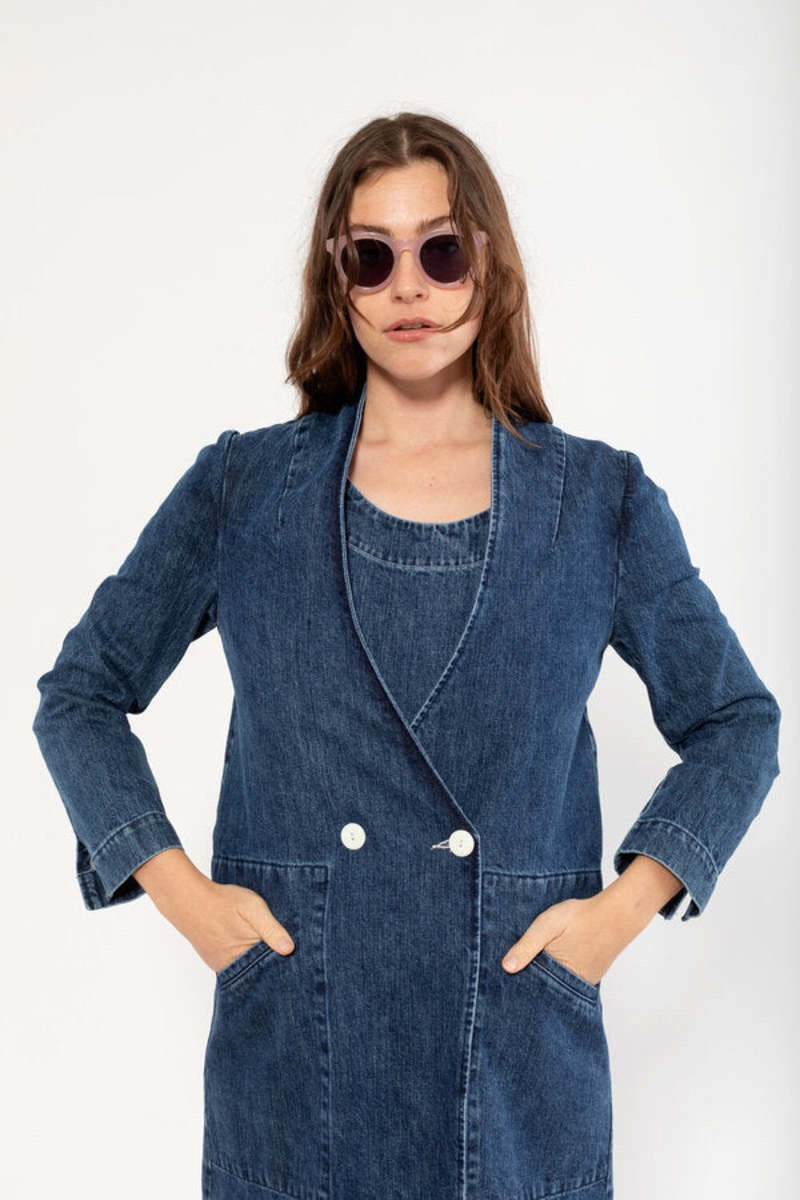 The Birdie Duster has a slightly oversized fit, and is made from a substantially-weighted denim. Features a deep v-neck and a double-breasted closure with contrast buttons. A classic and beautiful layer to wear with everything!