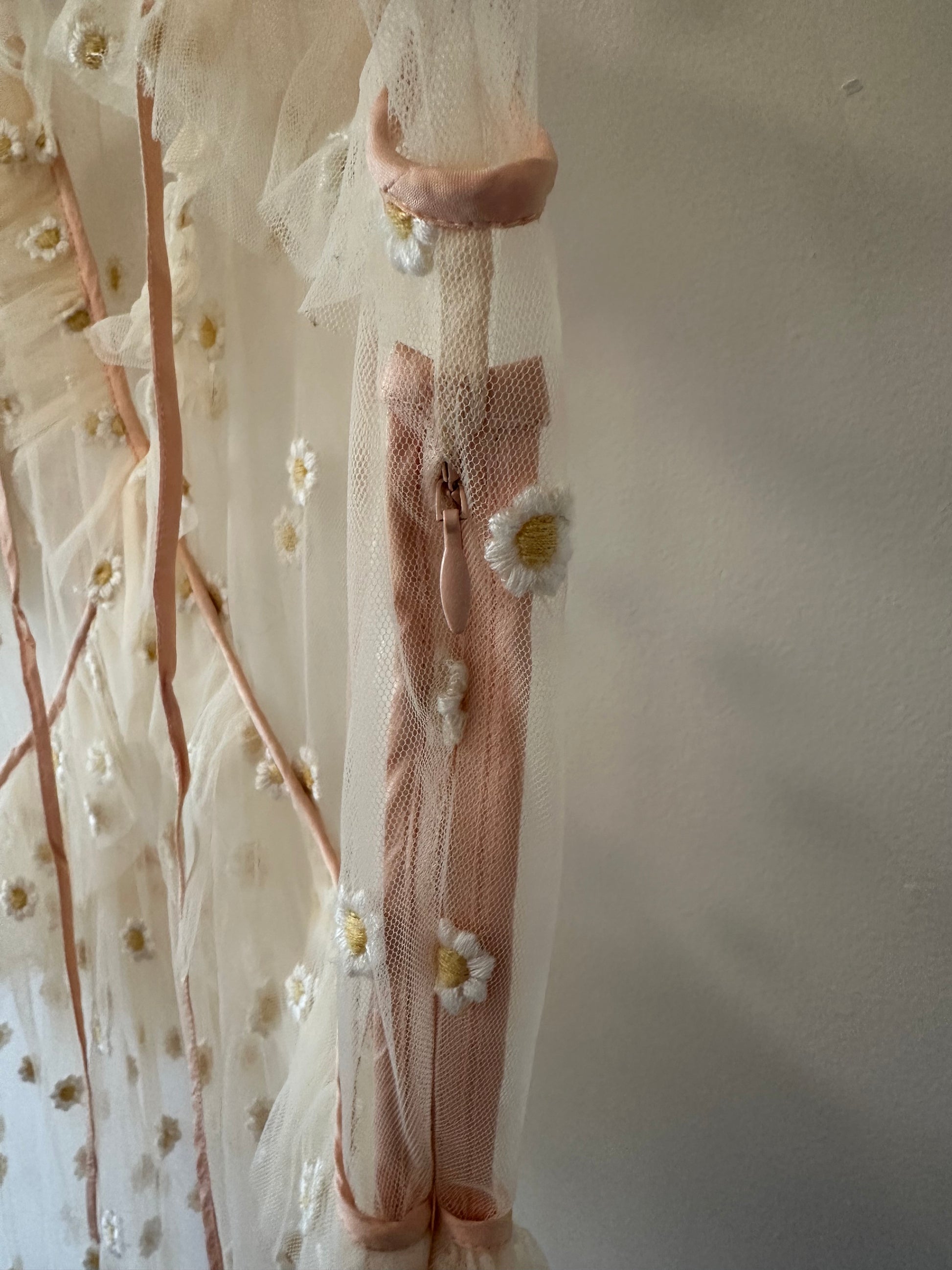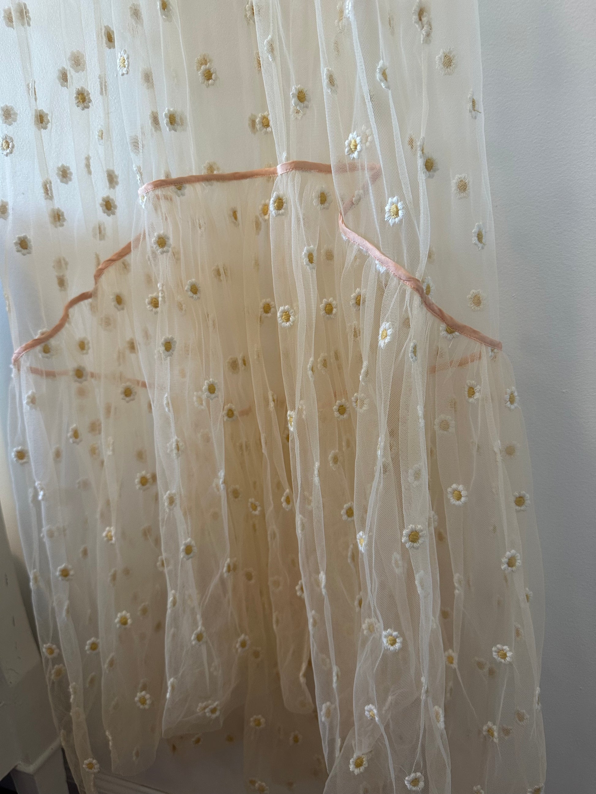 The dress features daisy/sunflower embroidery print, contrast satin trim and tie details, a deep V-keyhole neckline, and ruffled tiers.