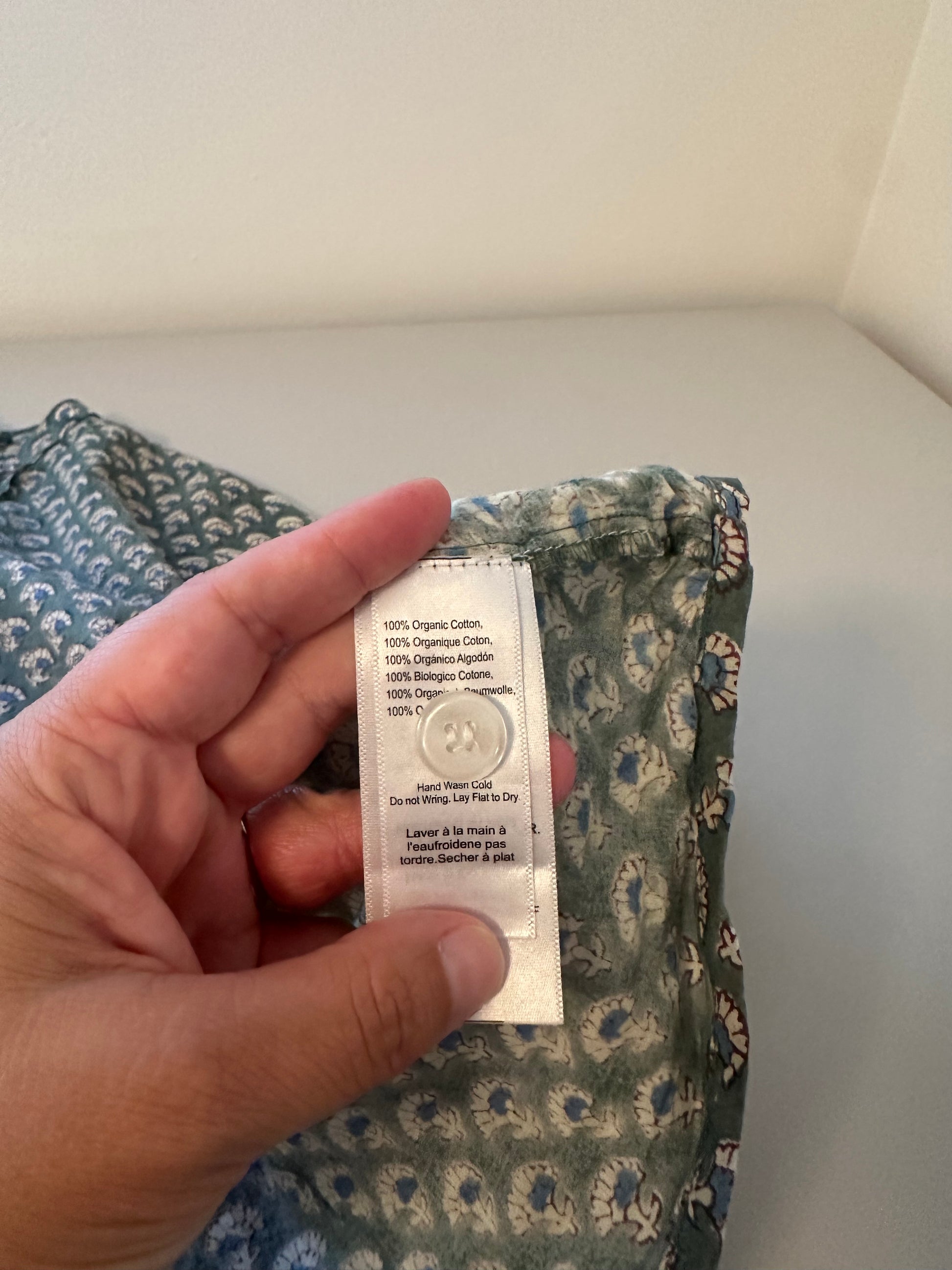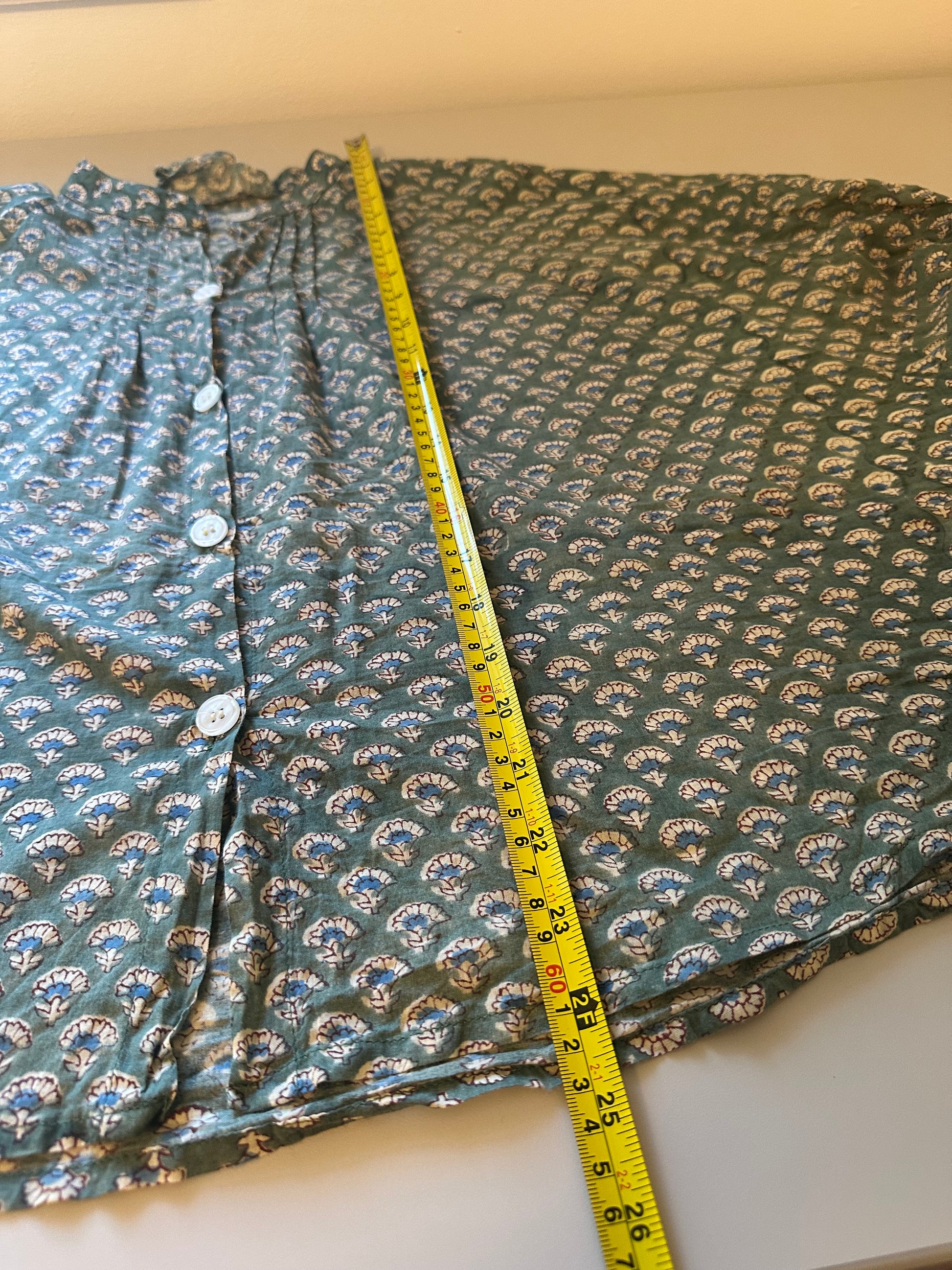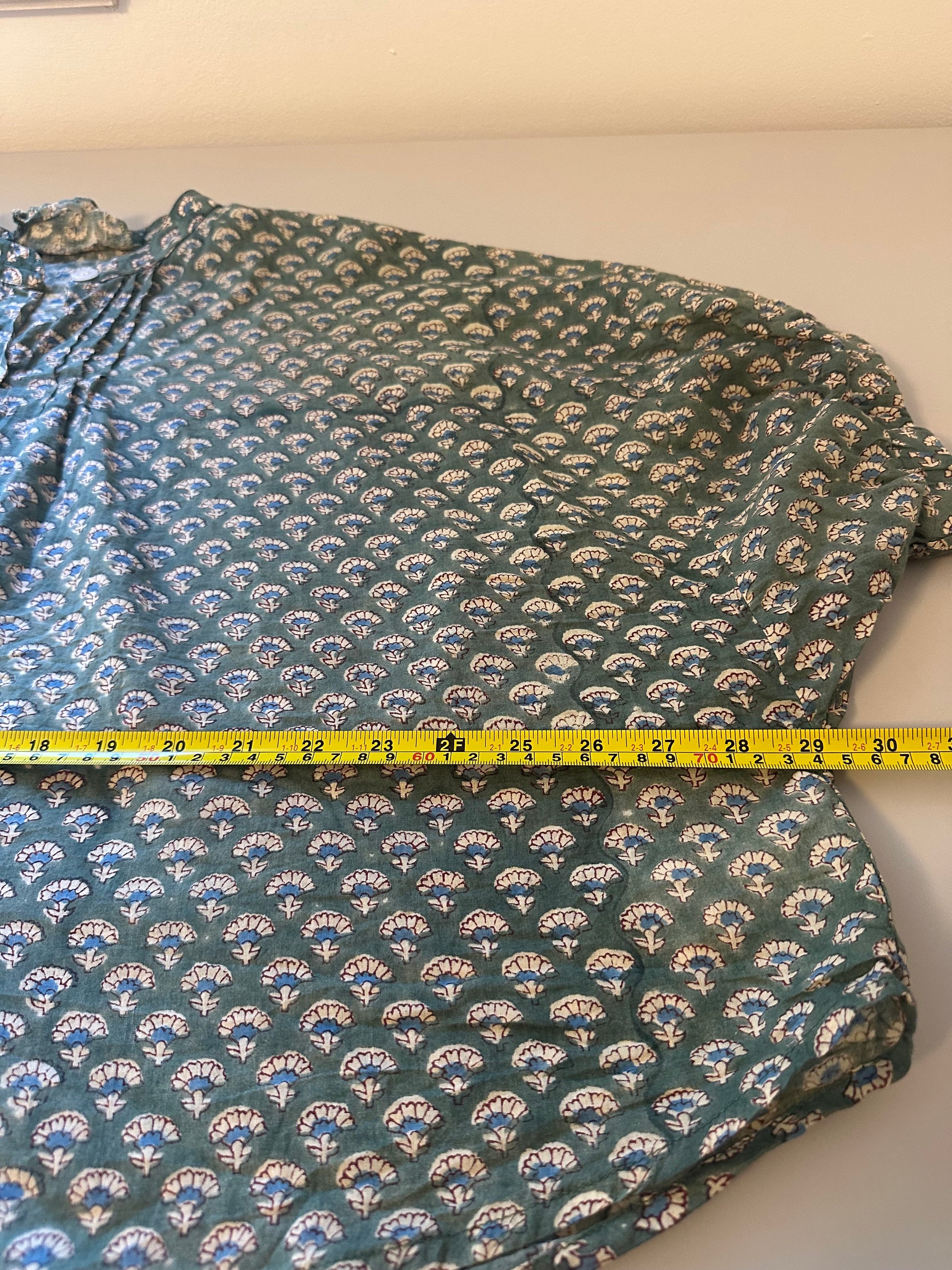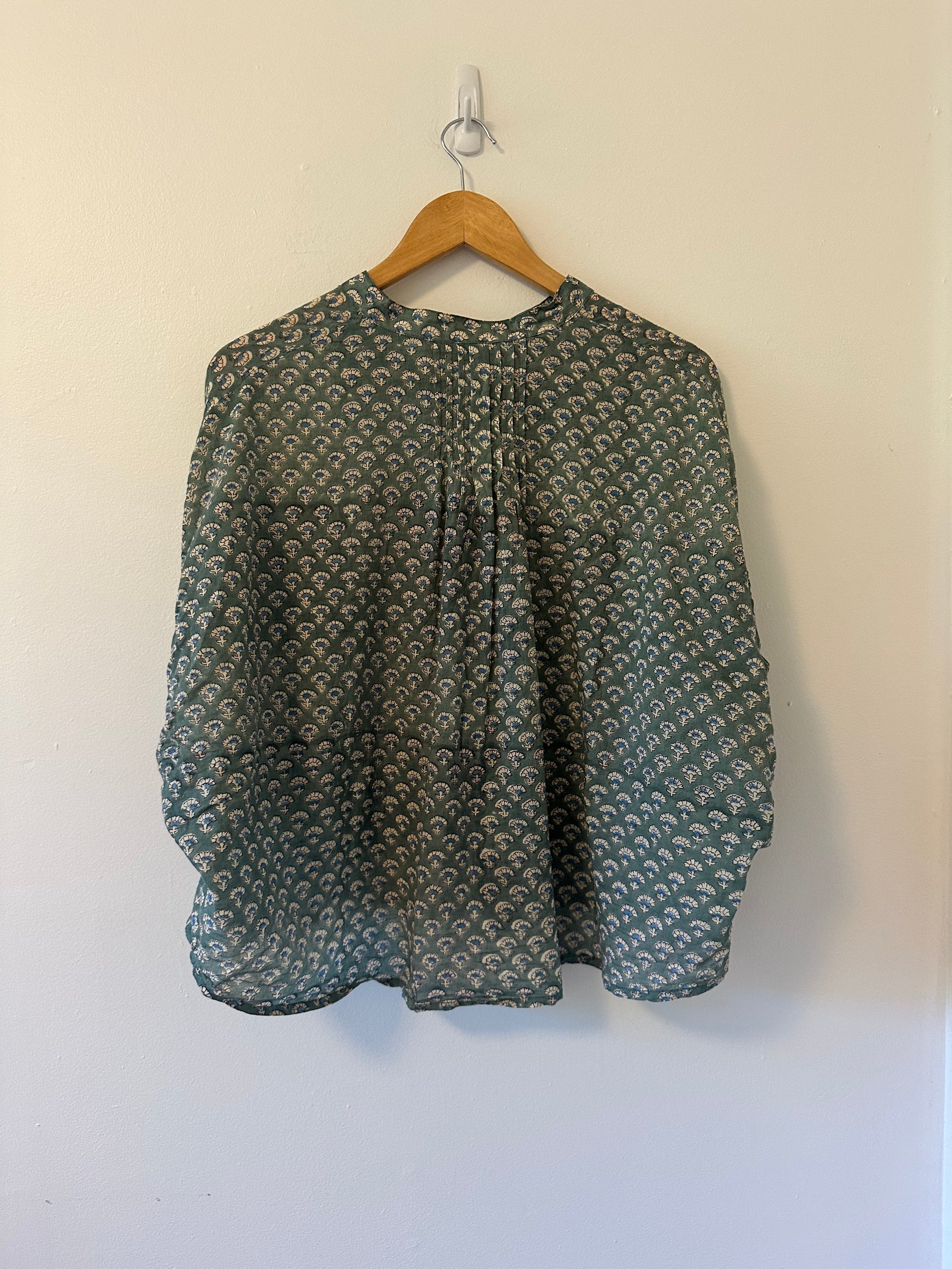 - Organic Cotton - Hand block printed and dyed using low impact dye - Button front shirt - One size - Mandarin style collar - Pintuck detail - Batwing style sleeve with elastic cuff - Hand wash, line dry - Made in Rajasthan, India
