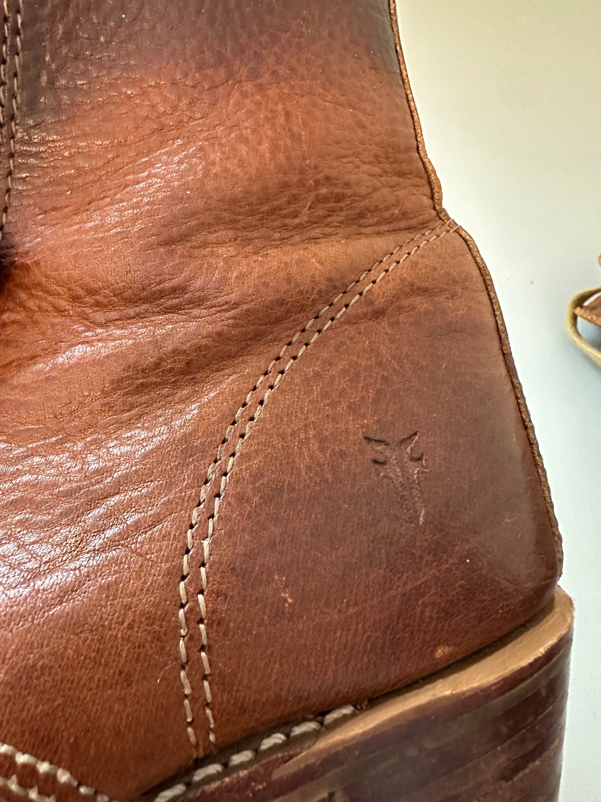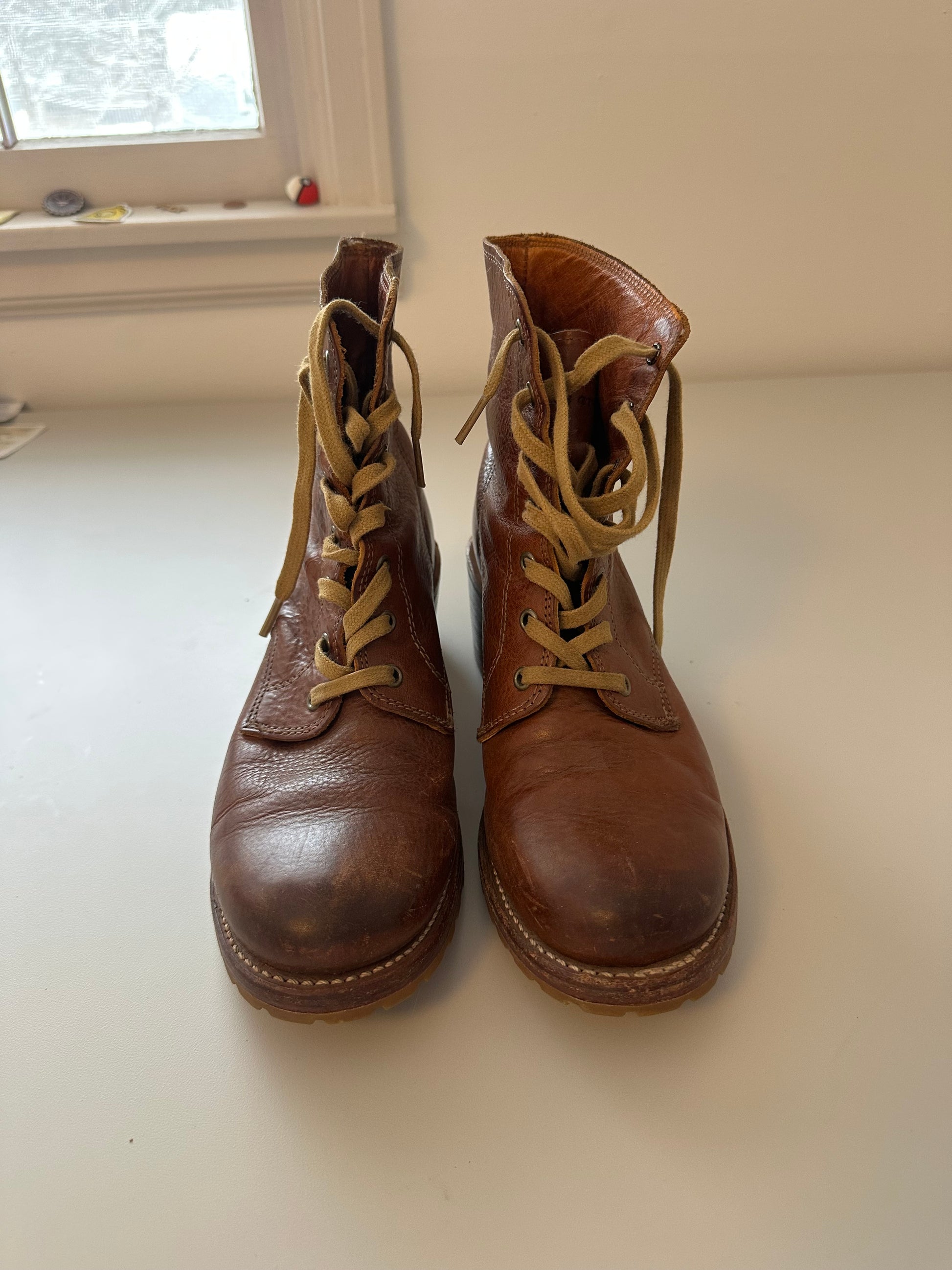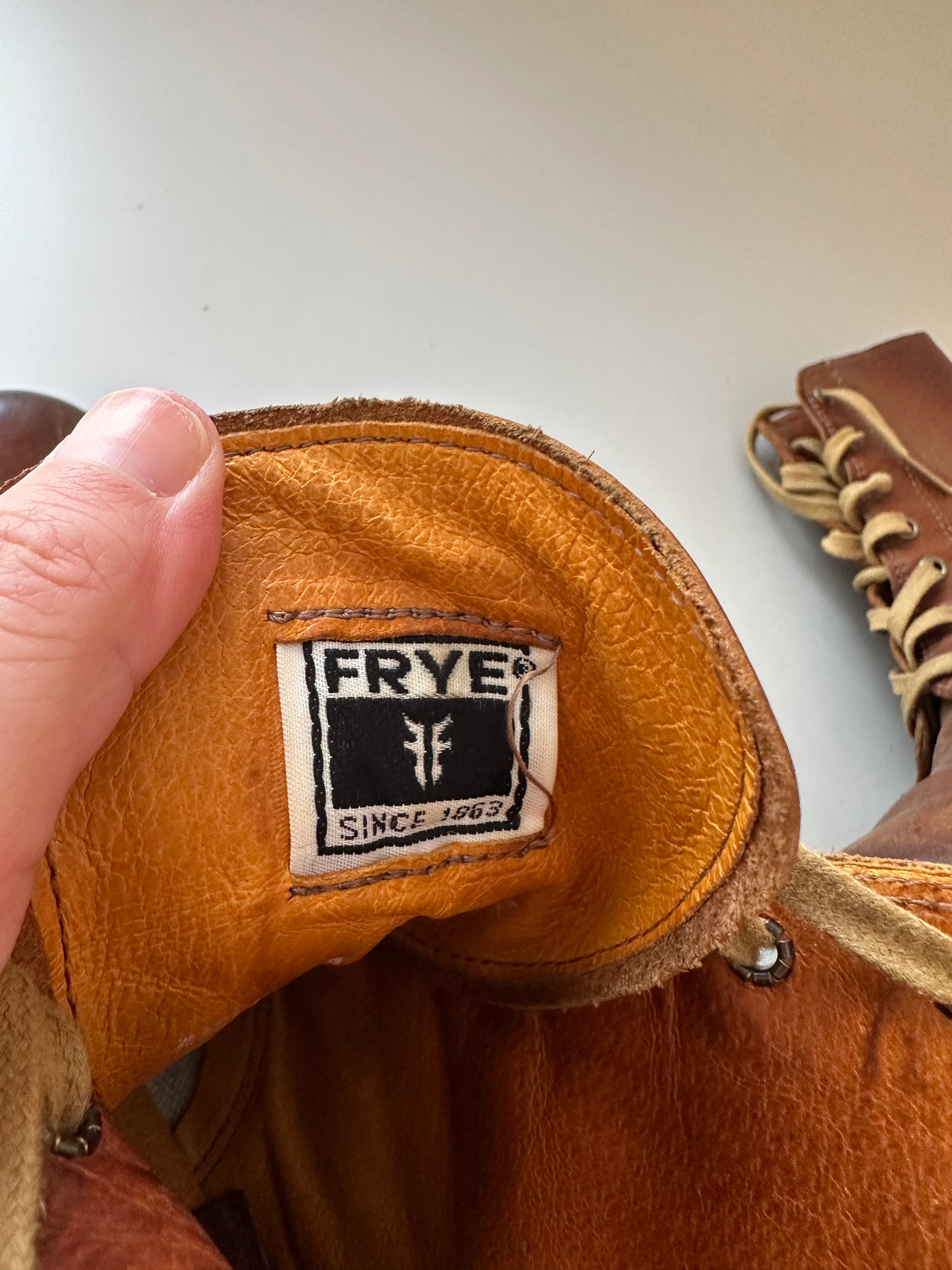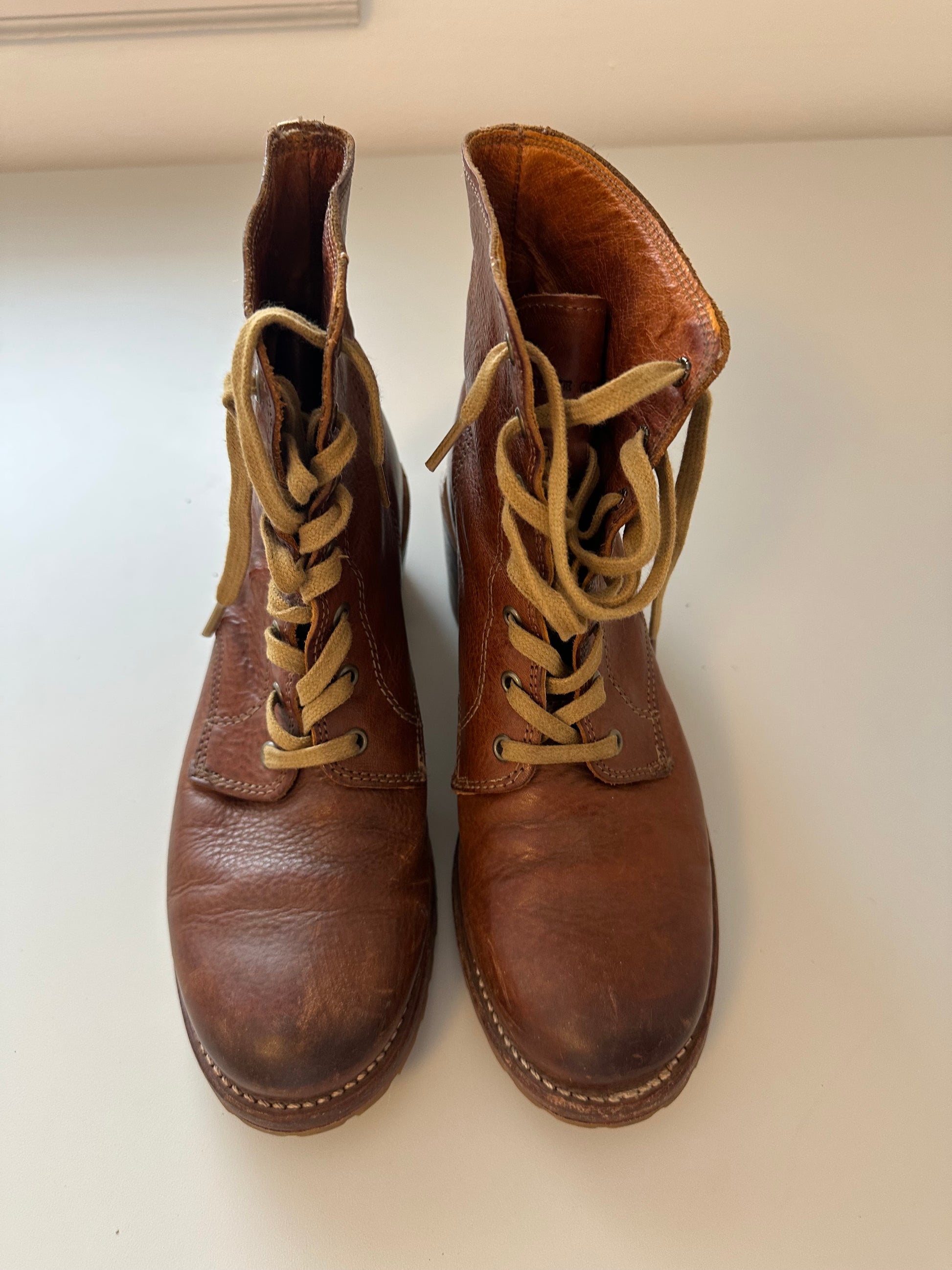 Frye Sabrina 6G Lace Up Heeled Boots in Distressed Cognac Leather | Size 9.5
