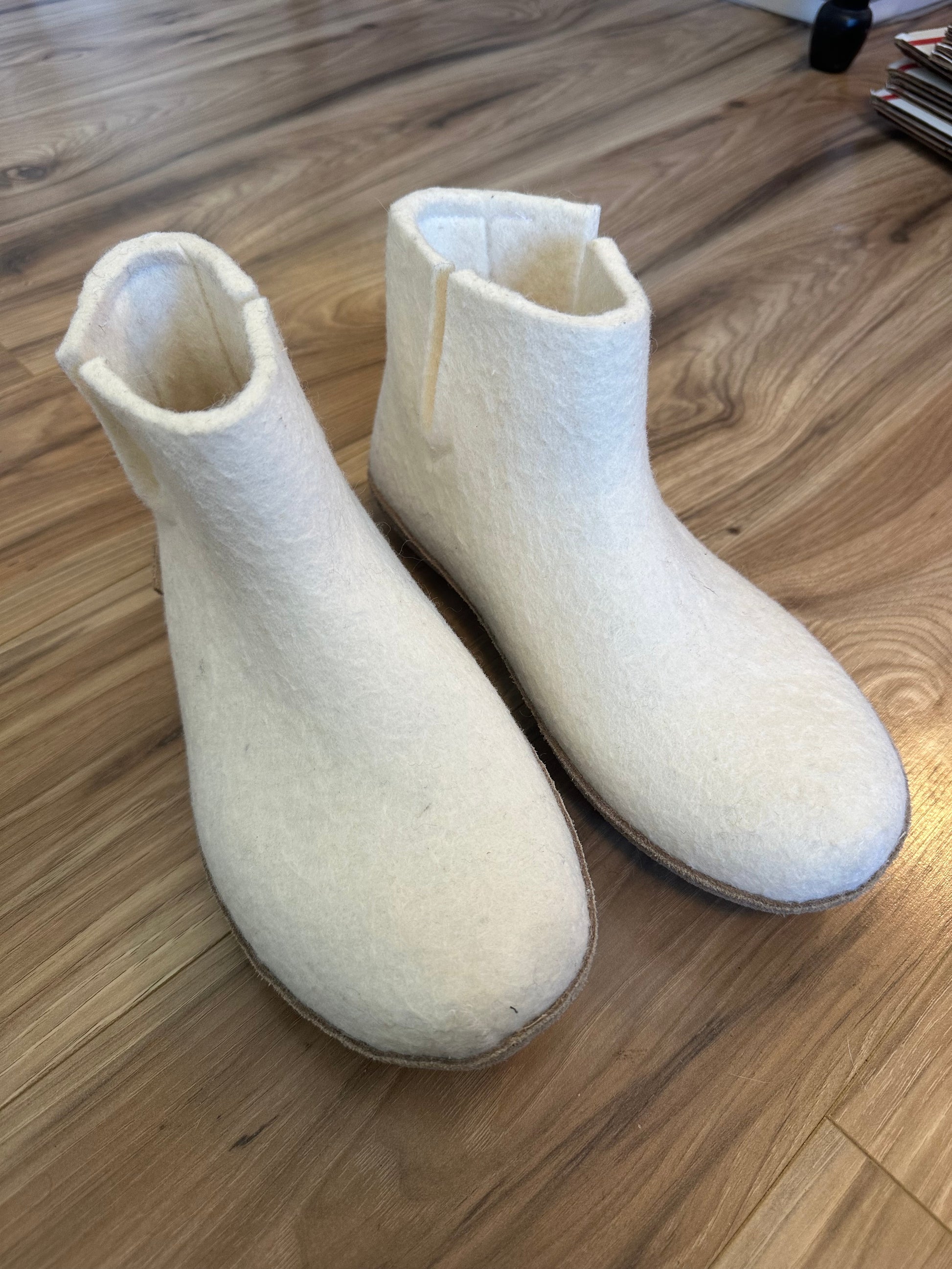Our boots are made of 100% pure, natural wool in the new colour, White, with a sole of soft and chrome-free calfskin.