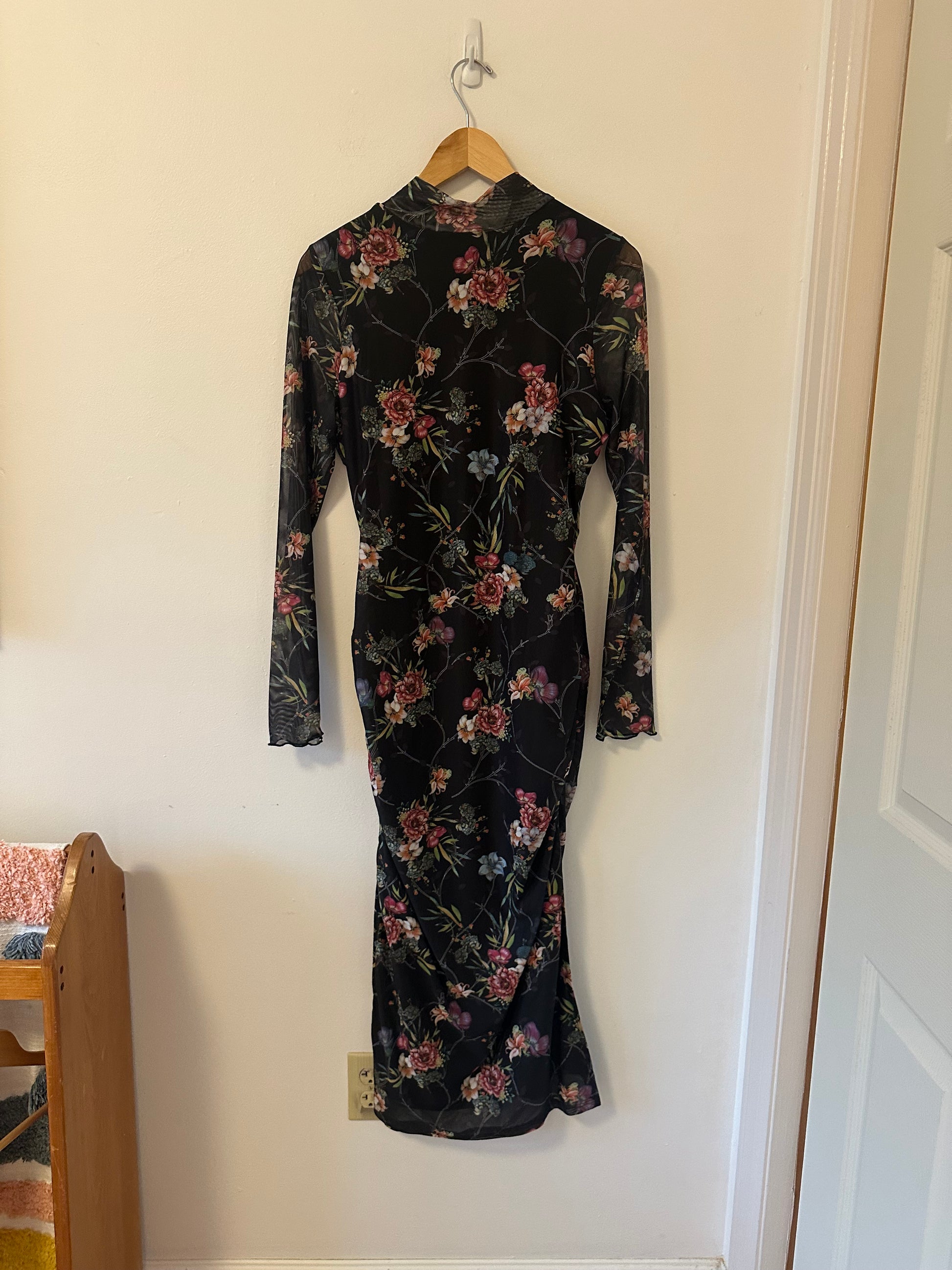 Heartloom The Sydney Black Floral Long Sleeve Mesh Mock Neck Dress | Size Large