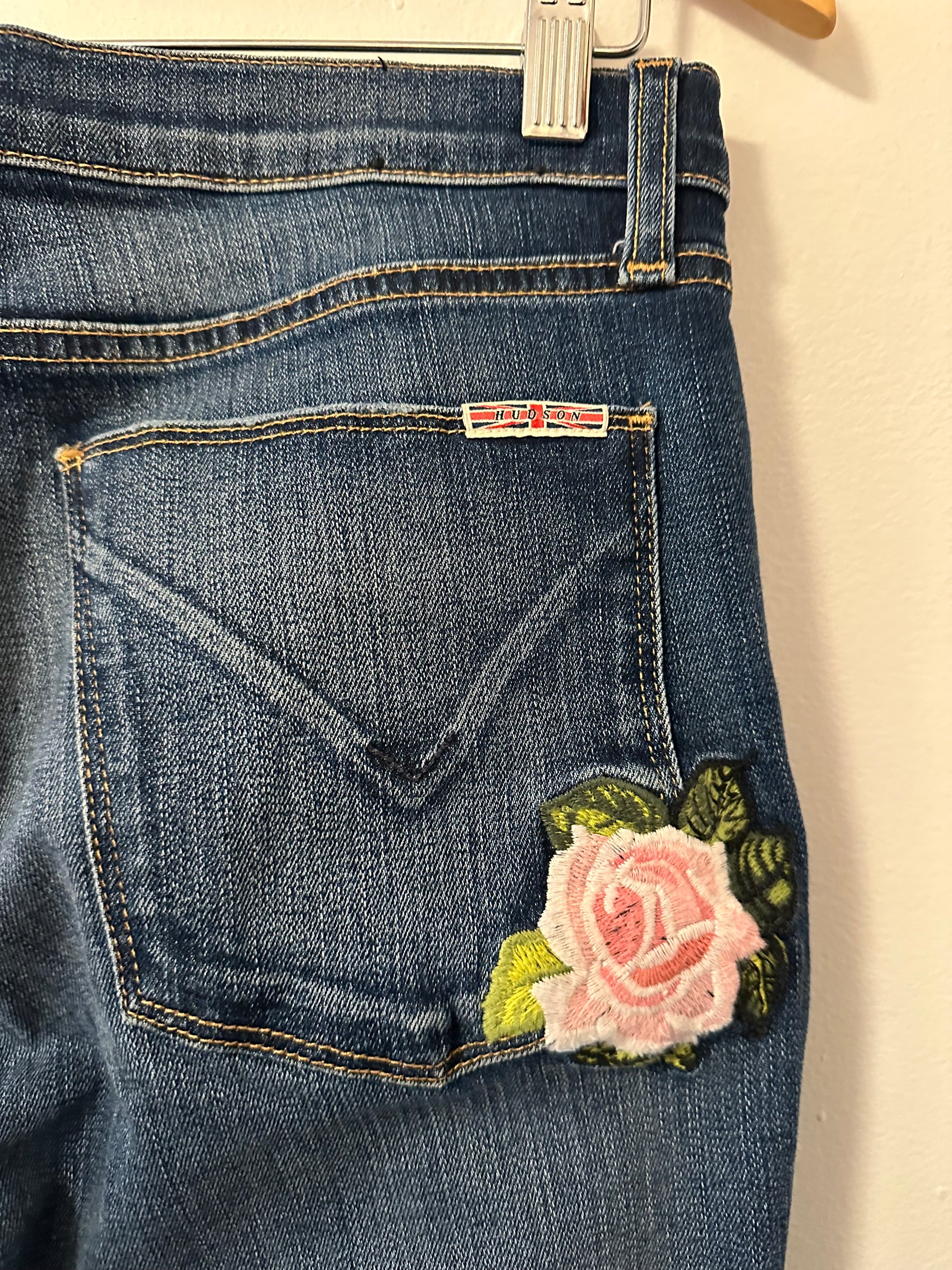 Hudson Jeans Dark Blue Mid Rise Skinny Jeans with Floral Embroidery | Size 28