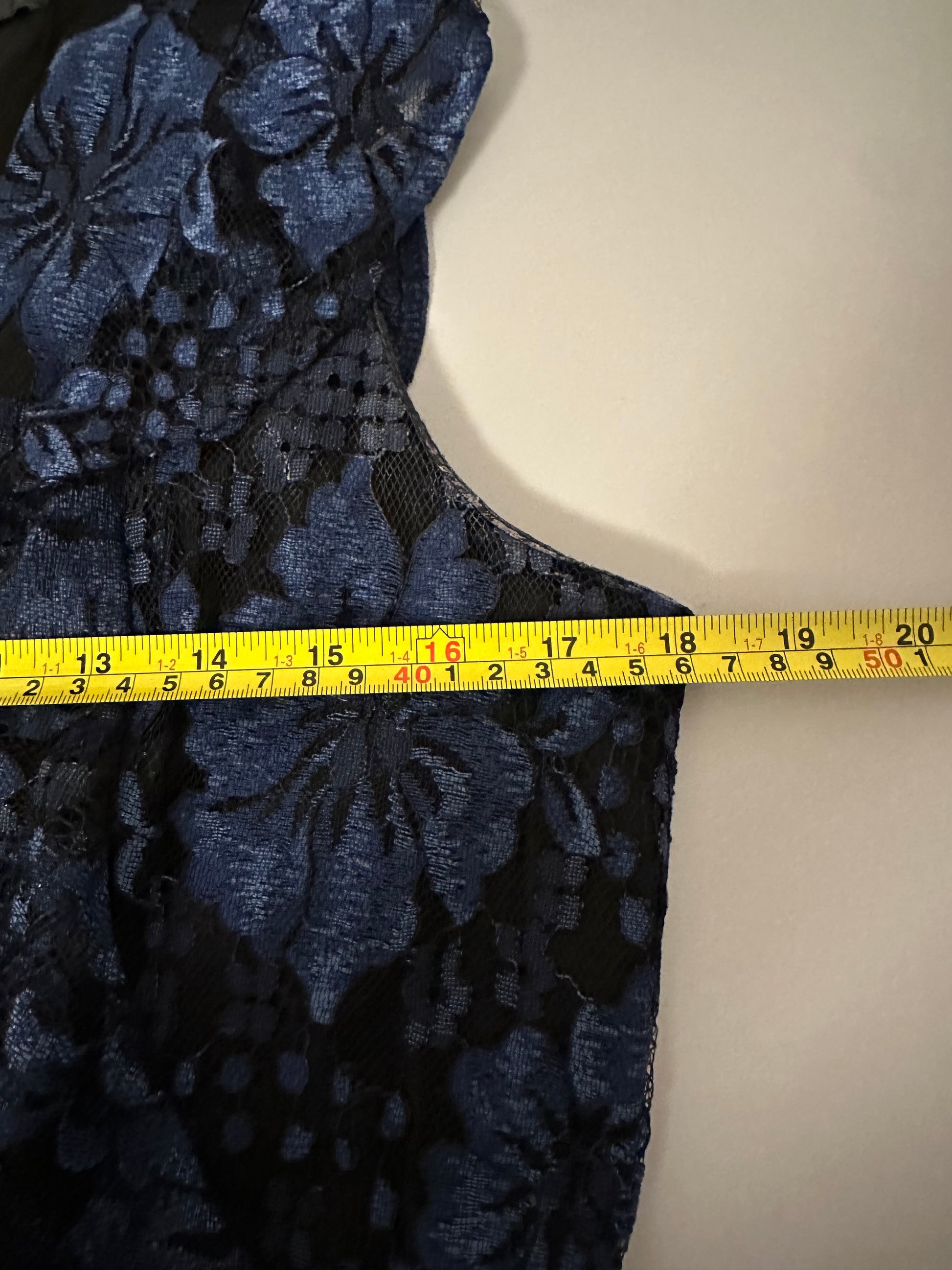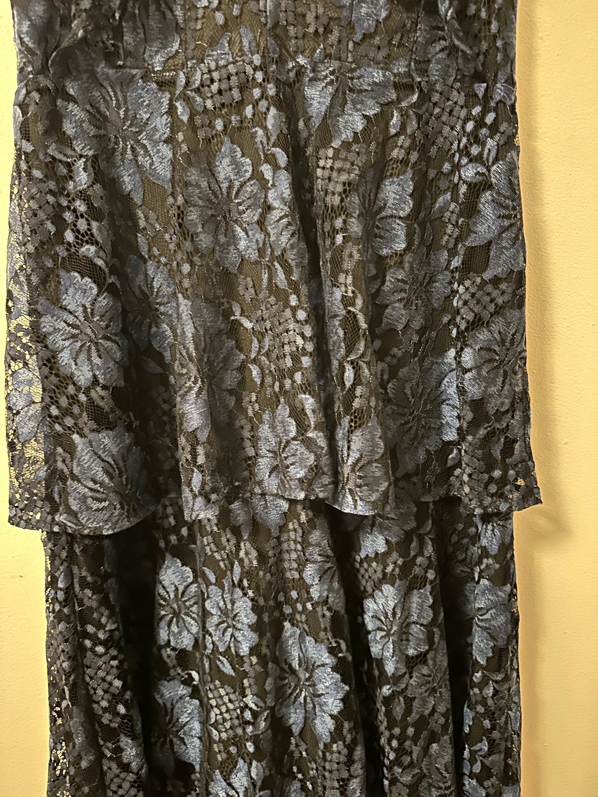 Lovely floral lace lays gracefully atop a black woven lining, shaping a deep V-neckline and a ruffled, sleeveless bodice. Cascading tiers fall effortlessly to an ankle-grazing maxi hem, completing the event-ready design. Hidden back zipper/clasp.
