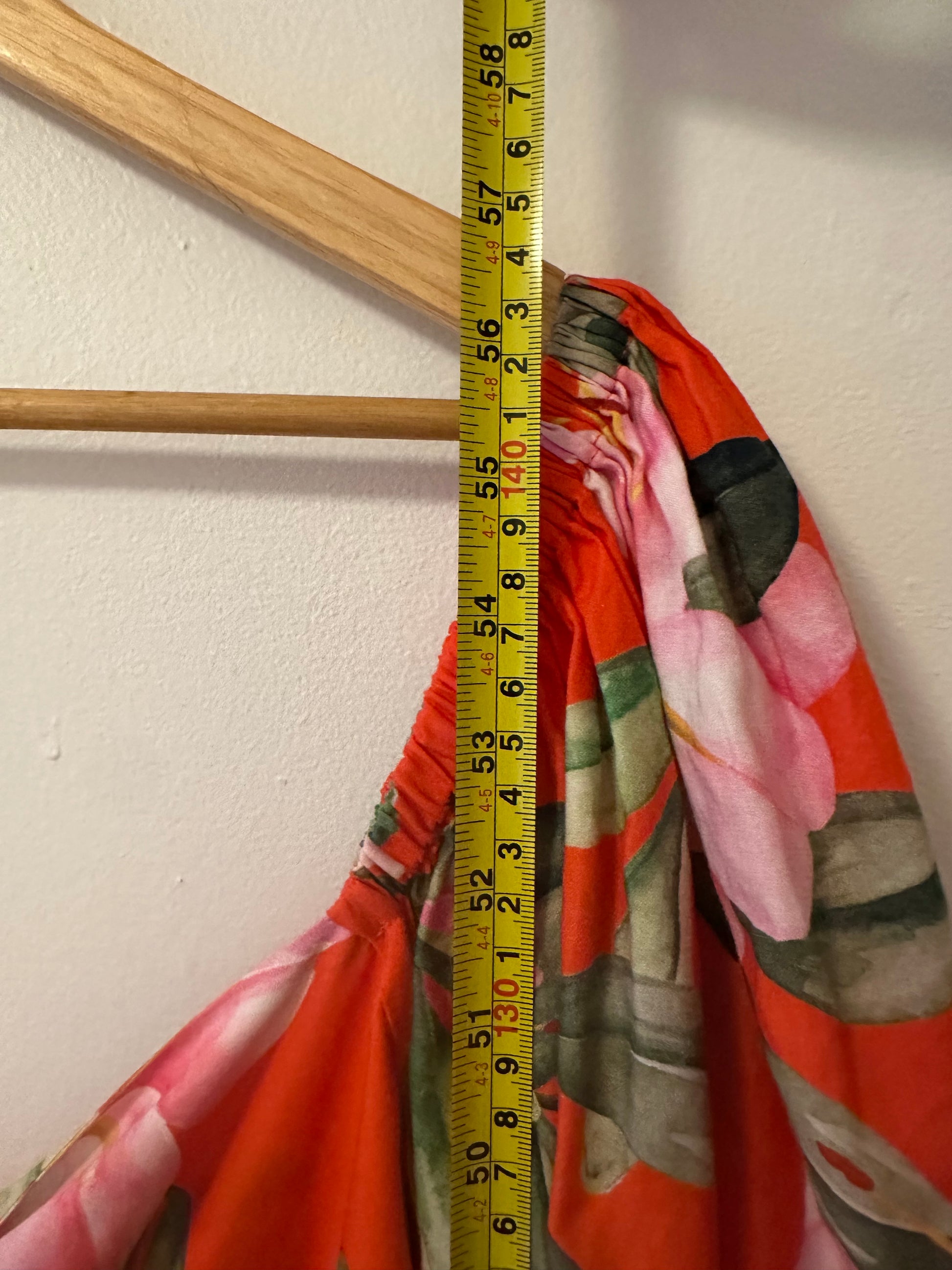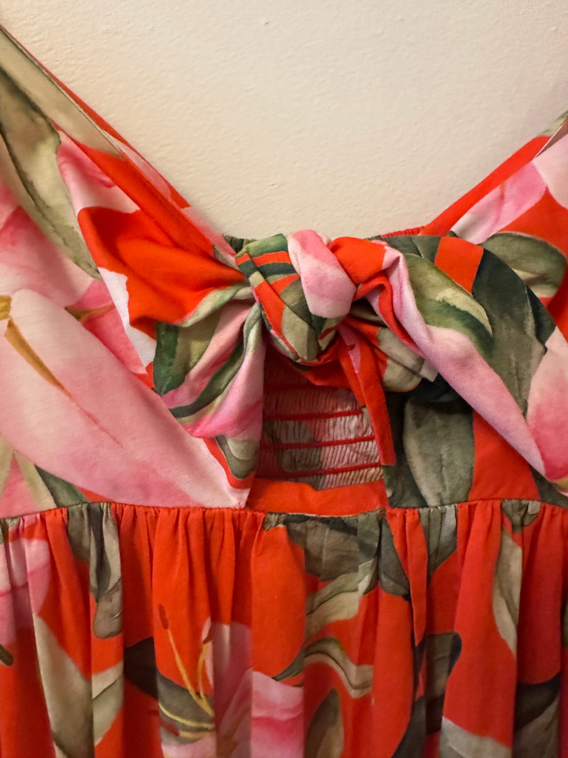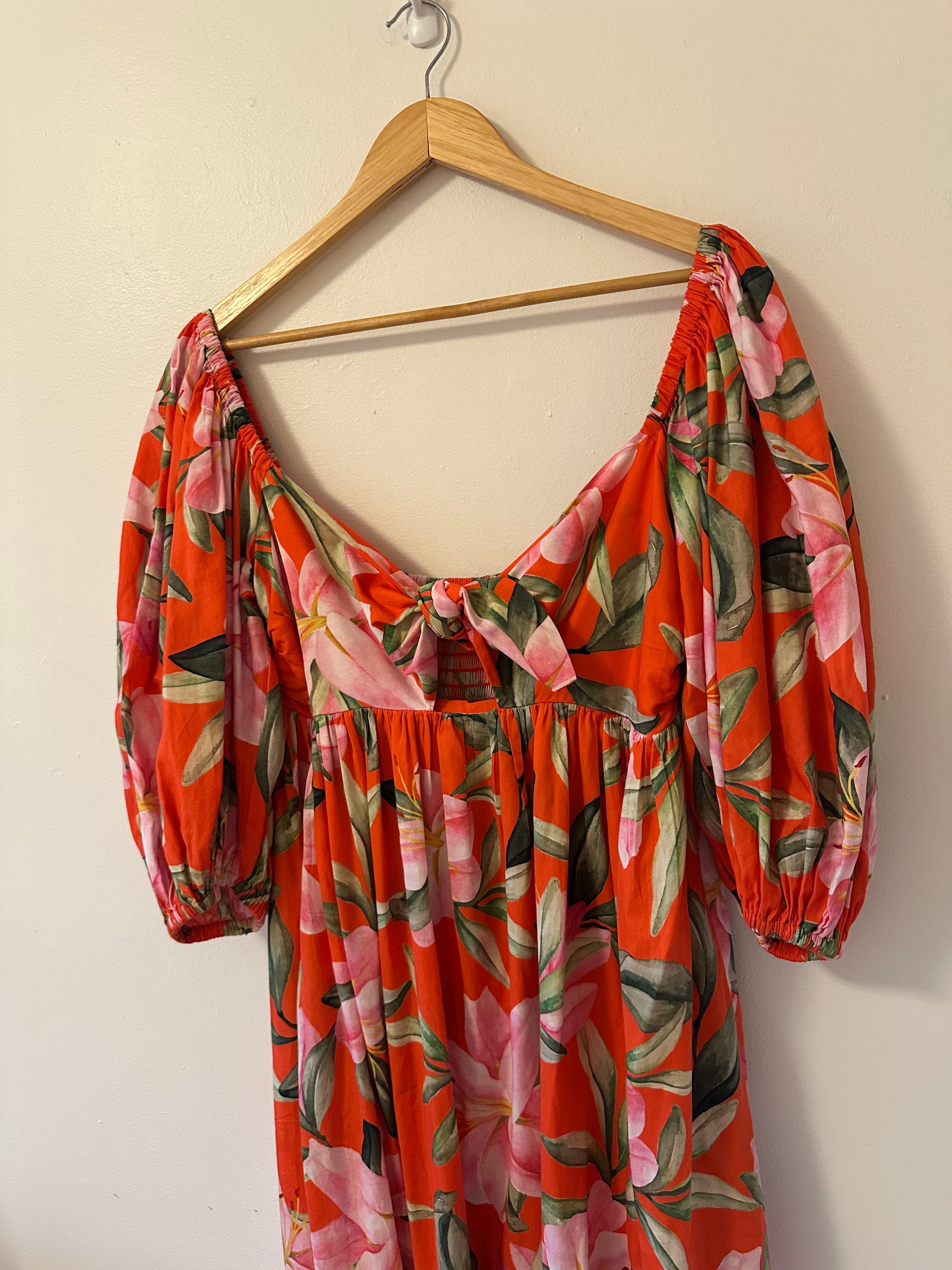 Violet tie front coverup dress in red lily floral print. Full puff sleeves. Smocking at back. Side pockets. - 100% organic cotton - Machine wash cold, tumble dry low