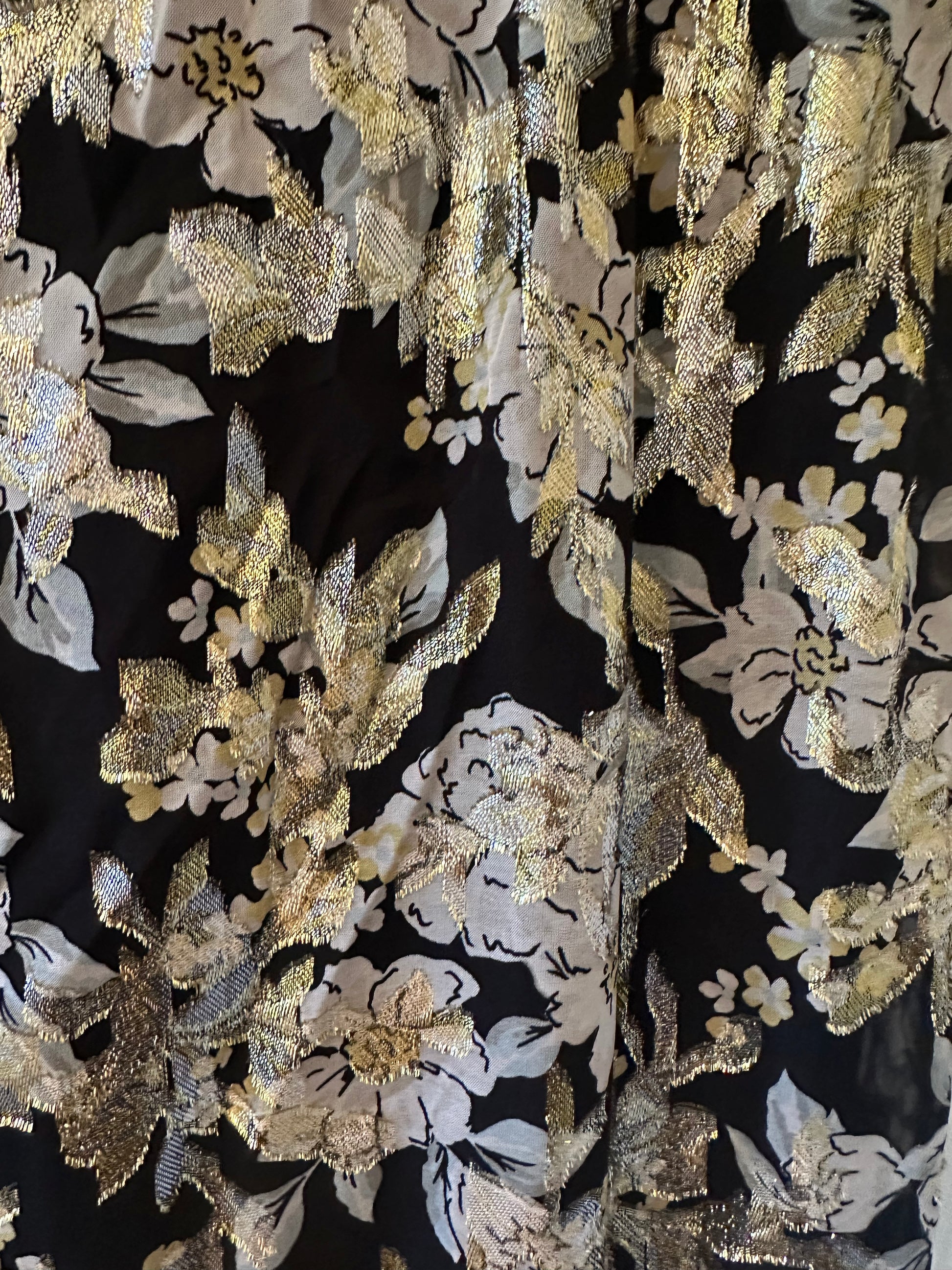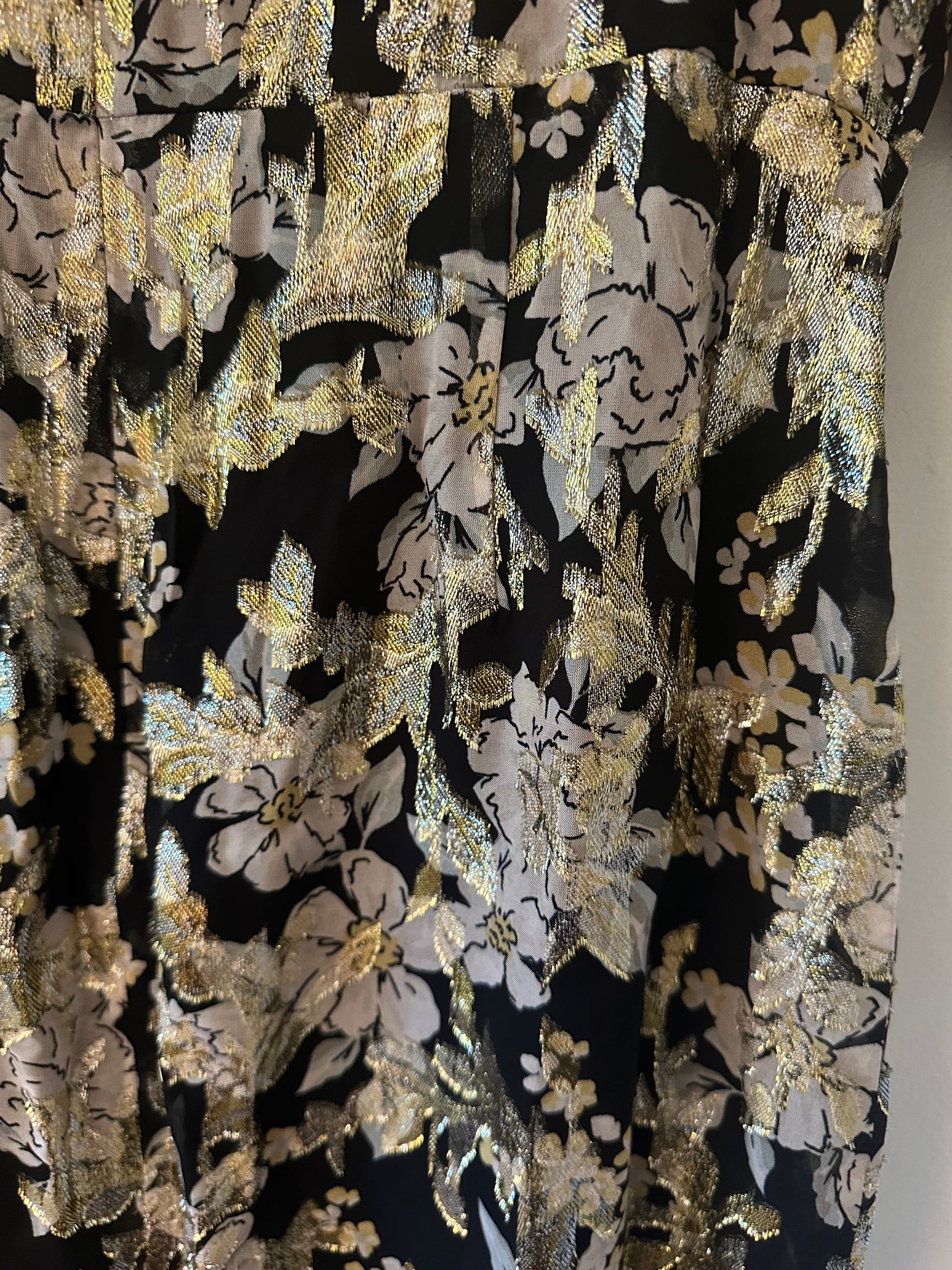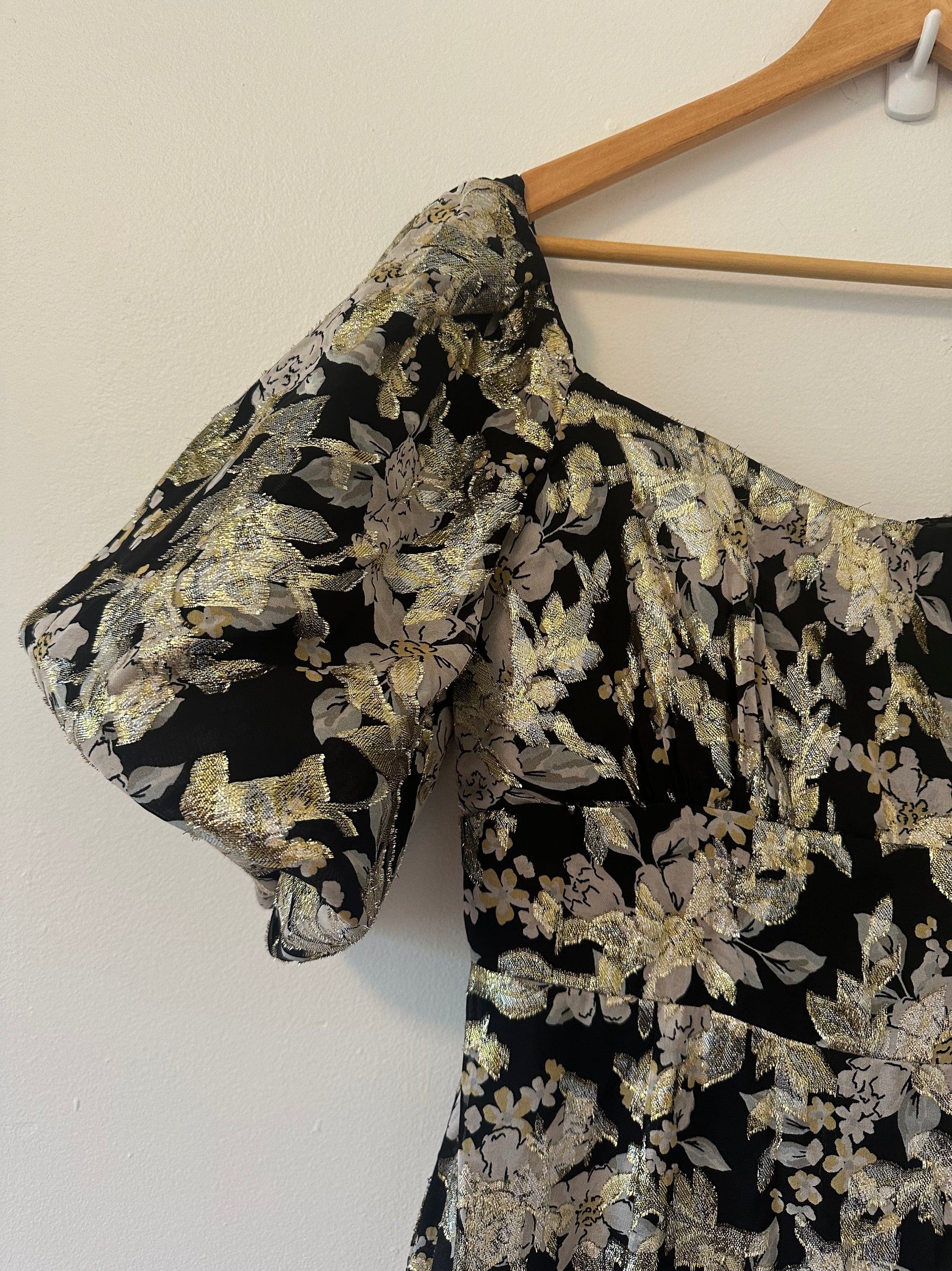 ML Monique Lhuillier Metallic Floral Midi Sheath Dress in Black, Gold, and Silver - Size 12