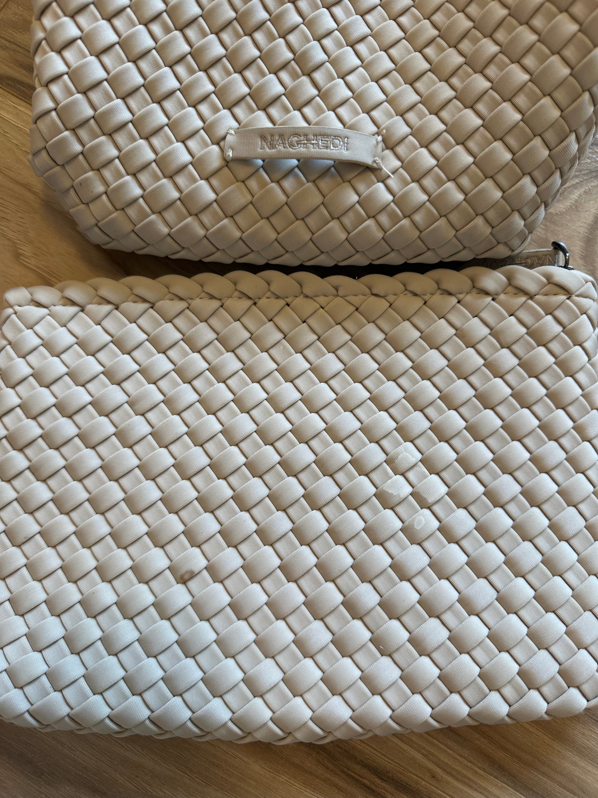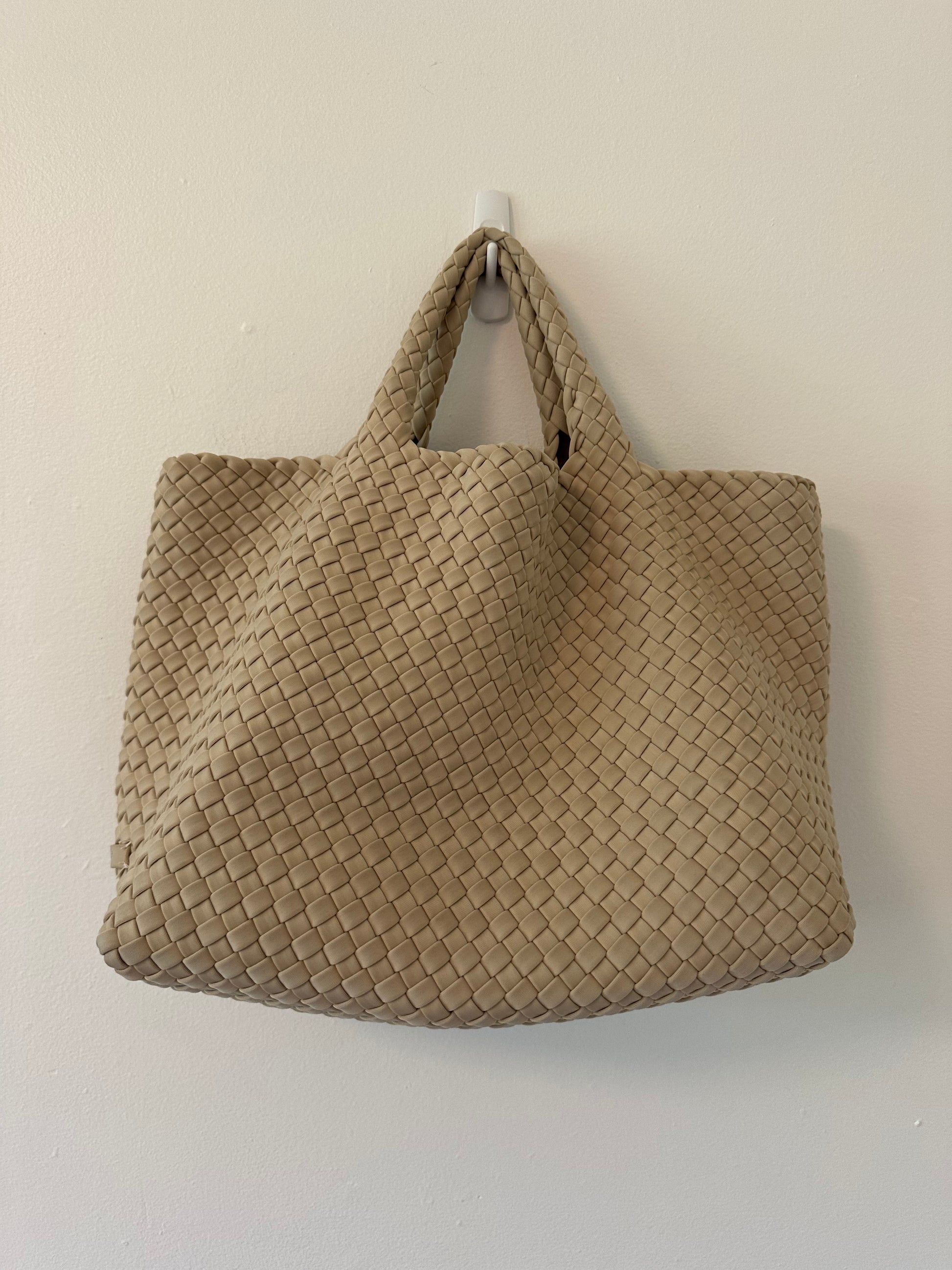 Handwoven neoprene in camel brown. Our original design, the St. Barths Medium Tote is a versatile, everyday bag for work, beach, or travel.