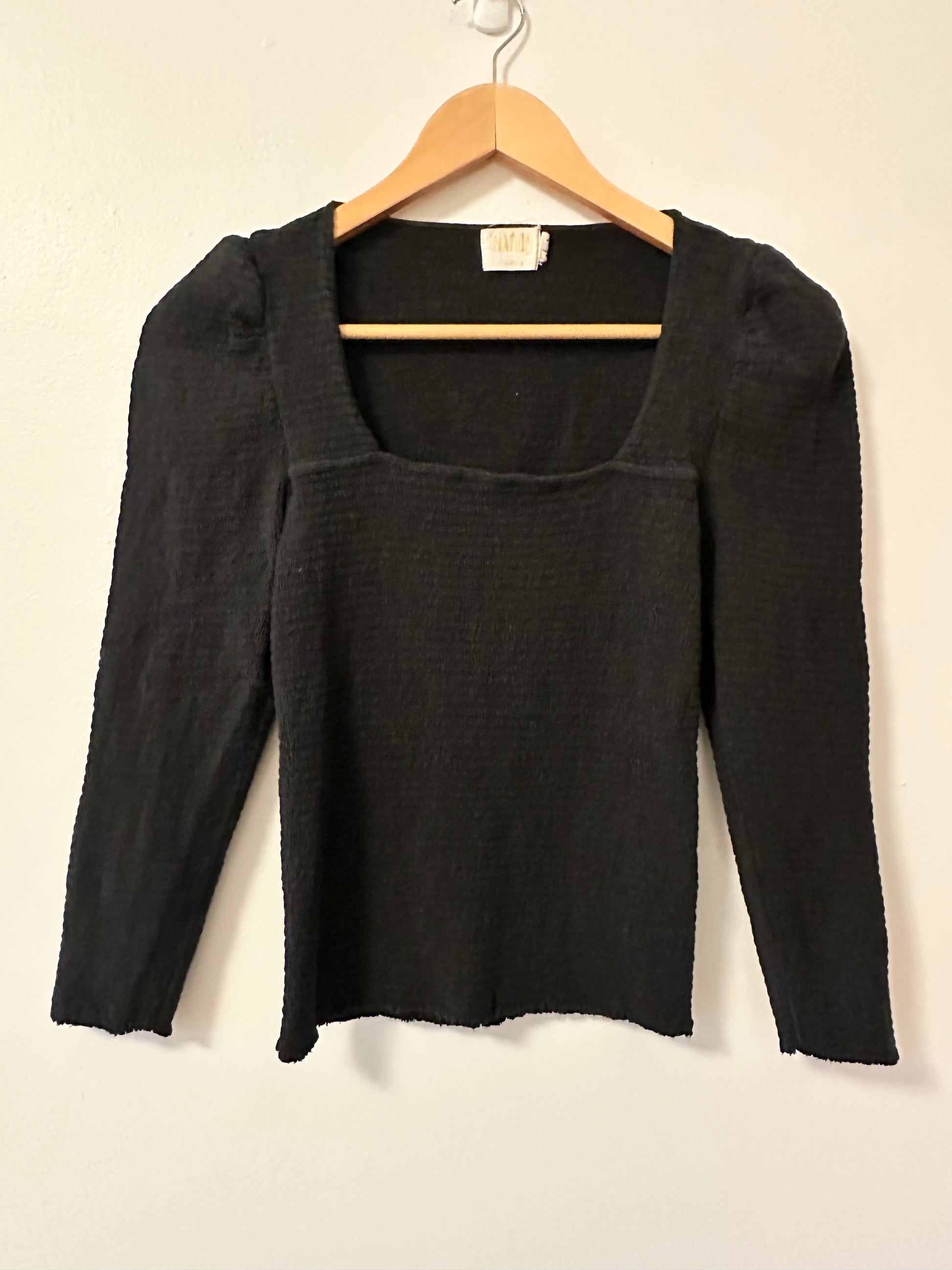 This all over jet black, smocked tee with perfectly puffed 3/4 length sleeves and a flattering square neckline is sure to become your new wardrobe hero. Fitted Reverse Slub/ 100% Pima Cotton Machine wash Made in Peru
