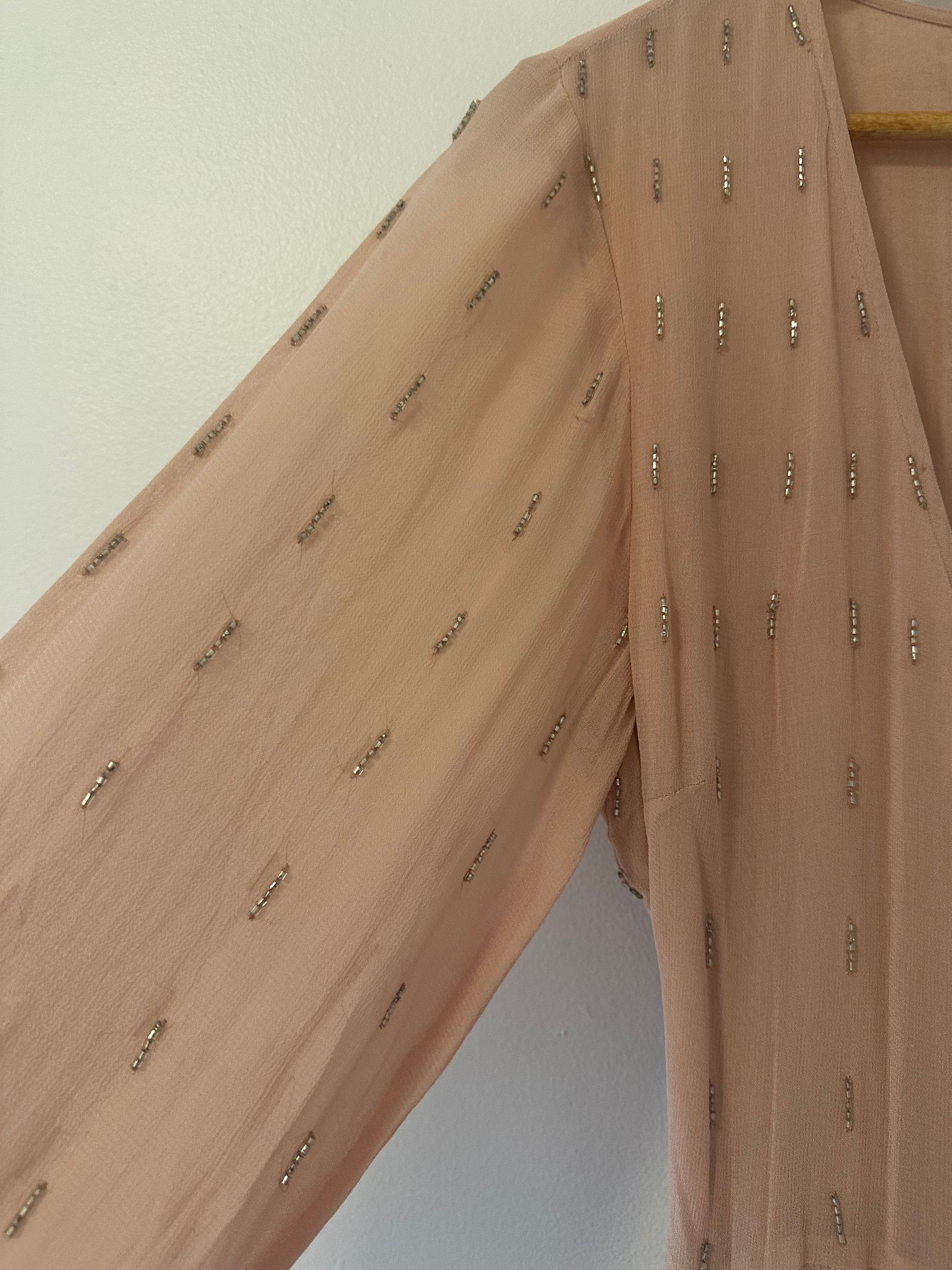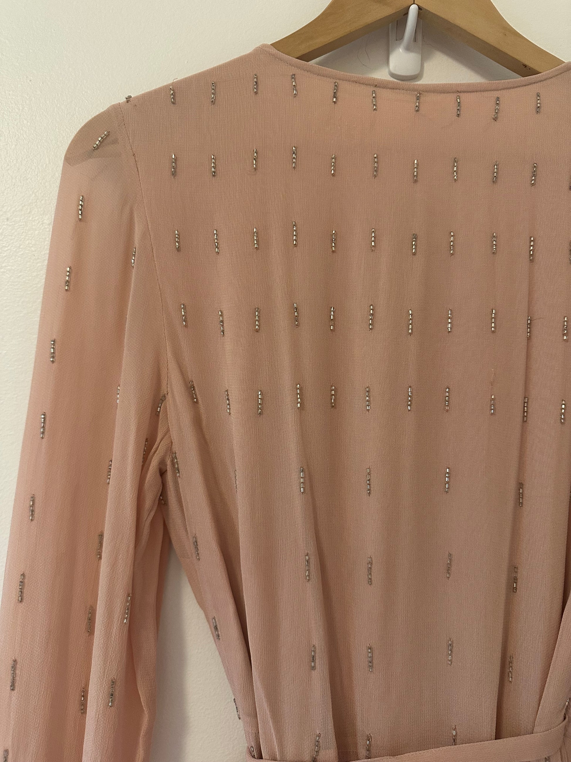 Long sleeve wrap dress in light pink with intricate allover beading.