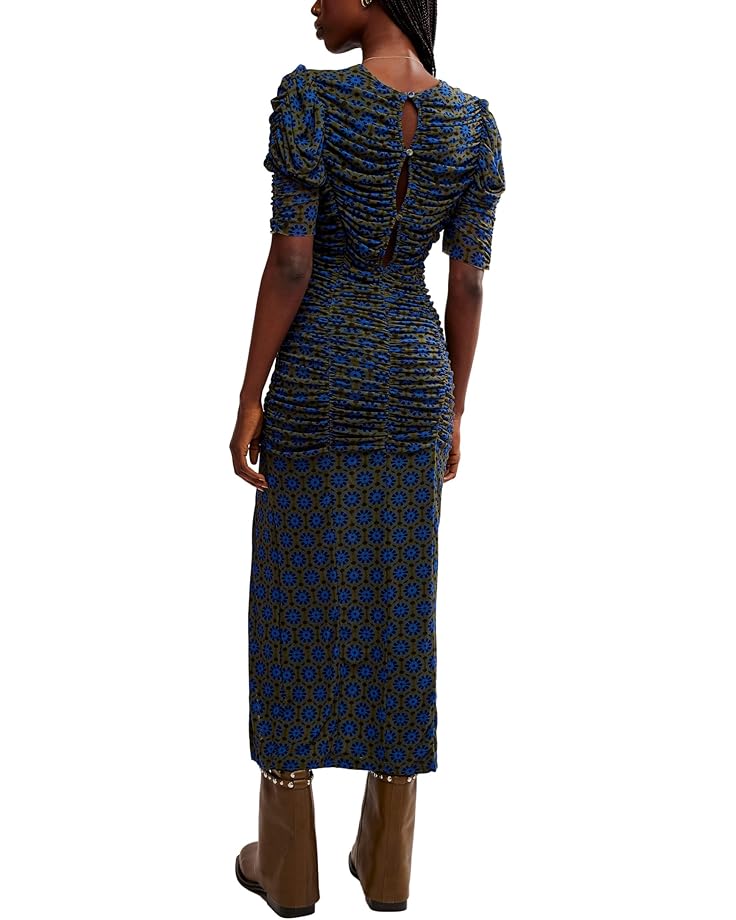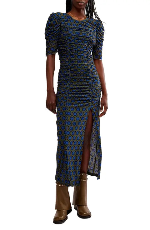 Stun in this beautiful midi dress featured in a floral printed, slightly puffed sleeve design with defined ruching throughout for added shape and dimension.