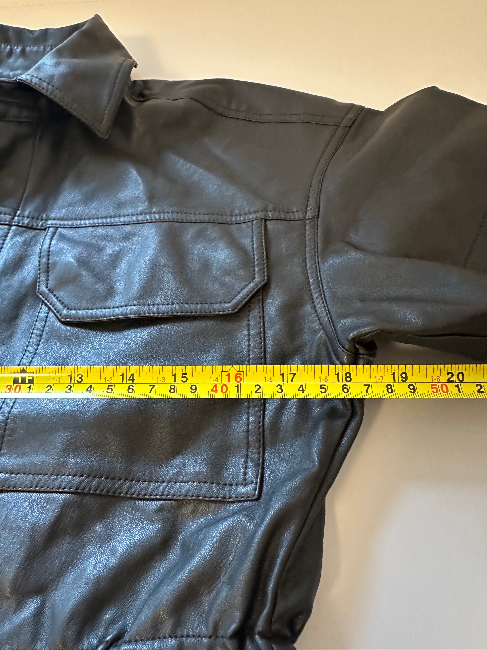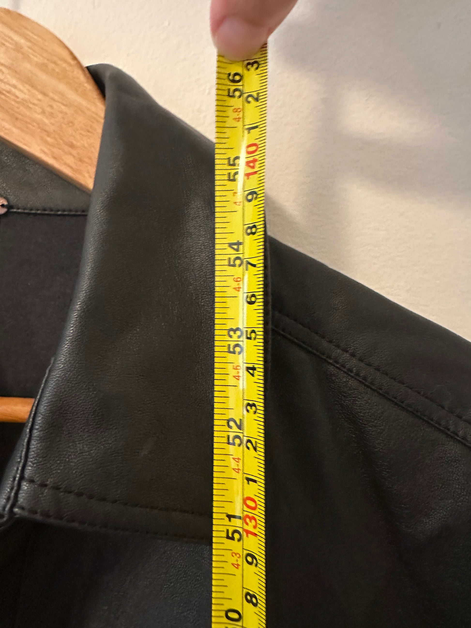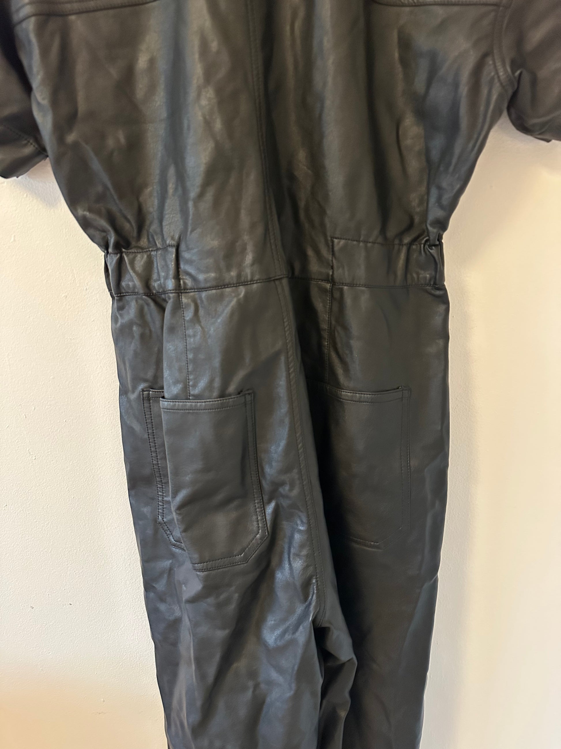 Super fun jumpsuit and black, vegan leather, elastic waist, short sleeves, and tapered legs