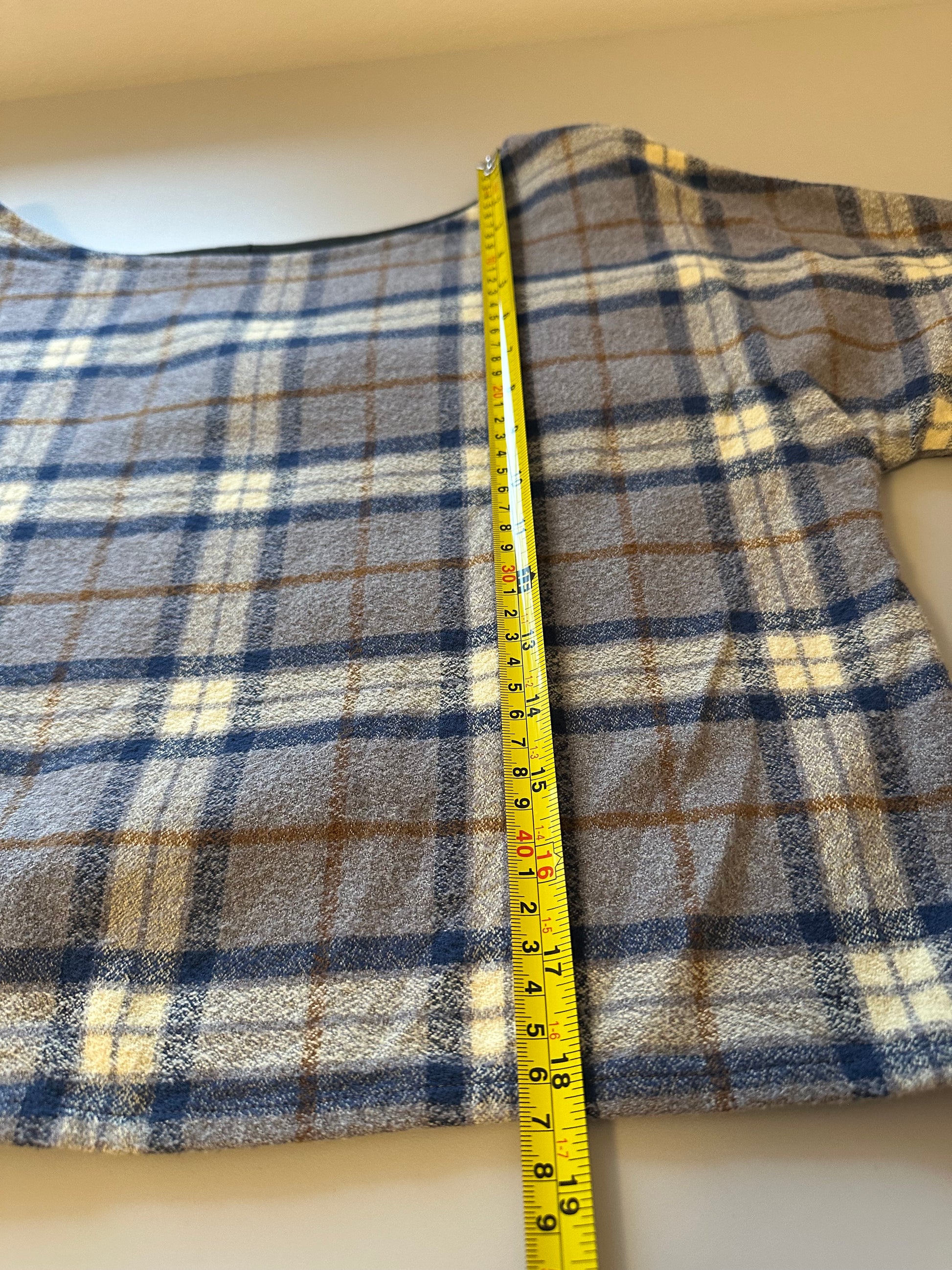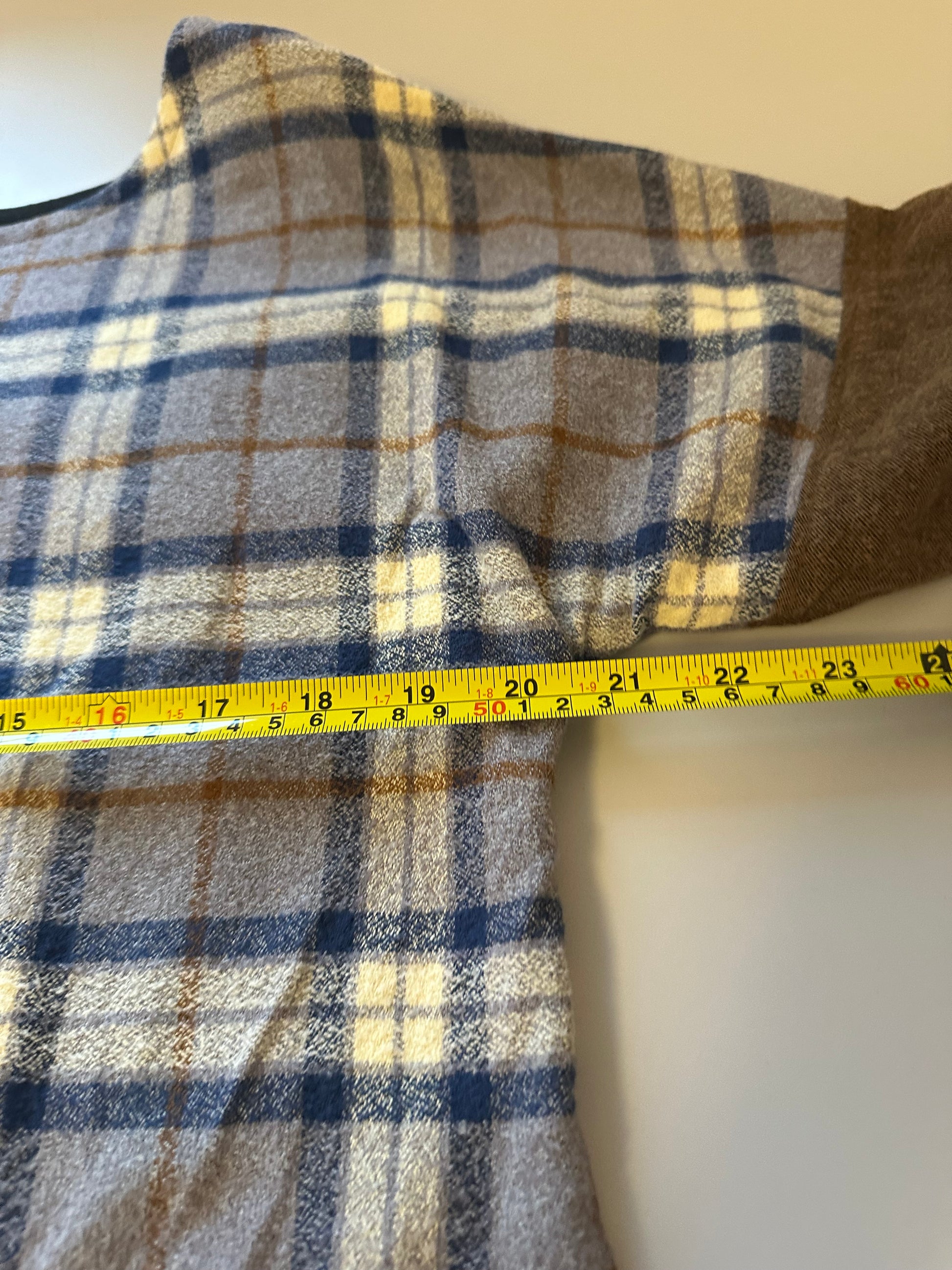 Body is brown mixed color plaid, sleeves are brown