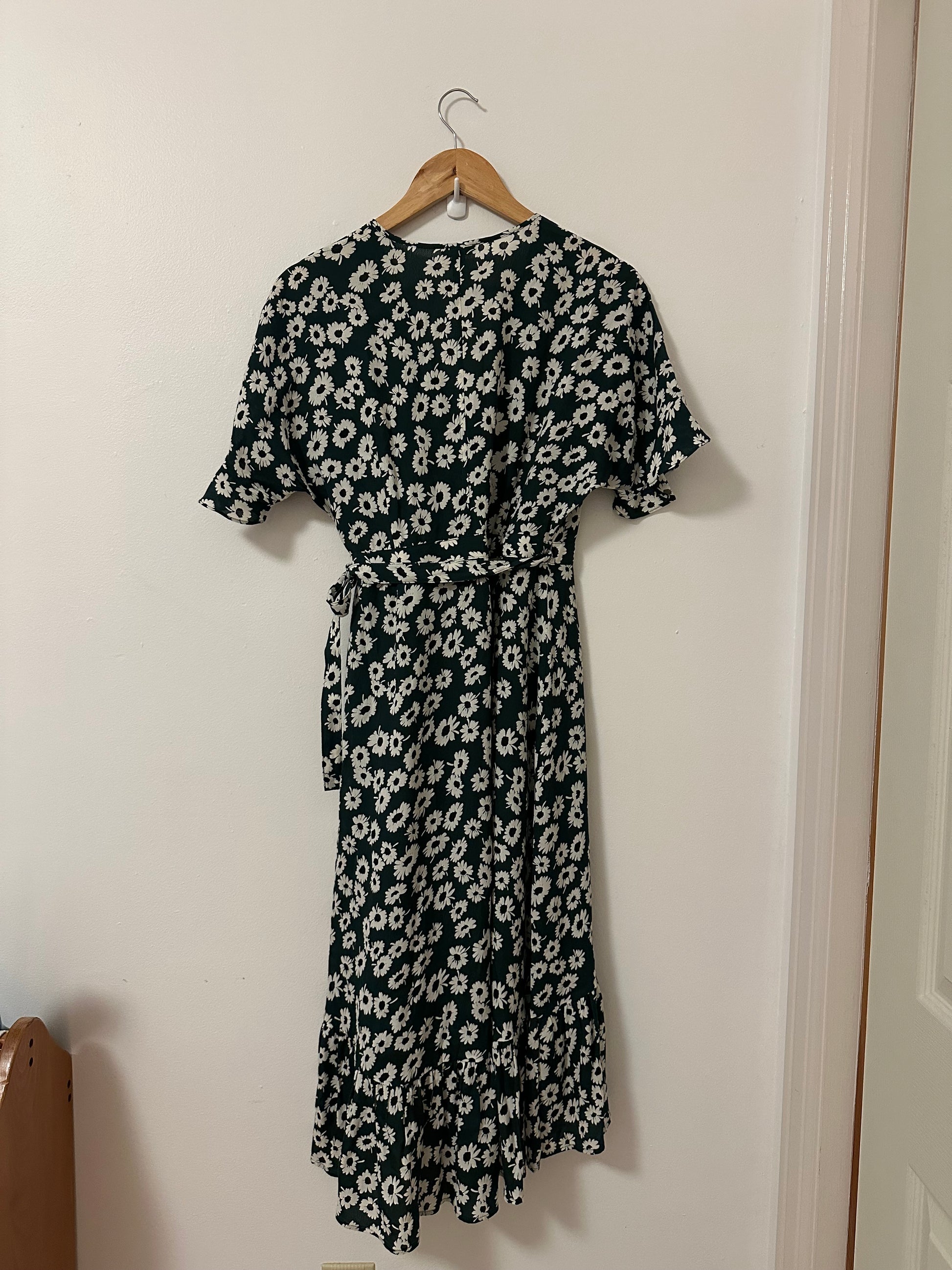 Daisies drive the design of this frill-finished dress cut in an always-flattering wrap silhouette.