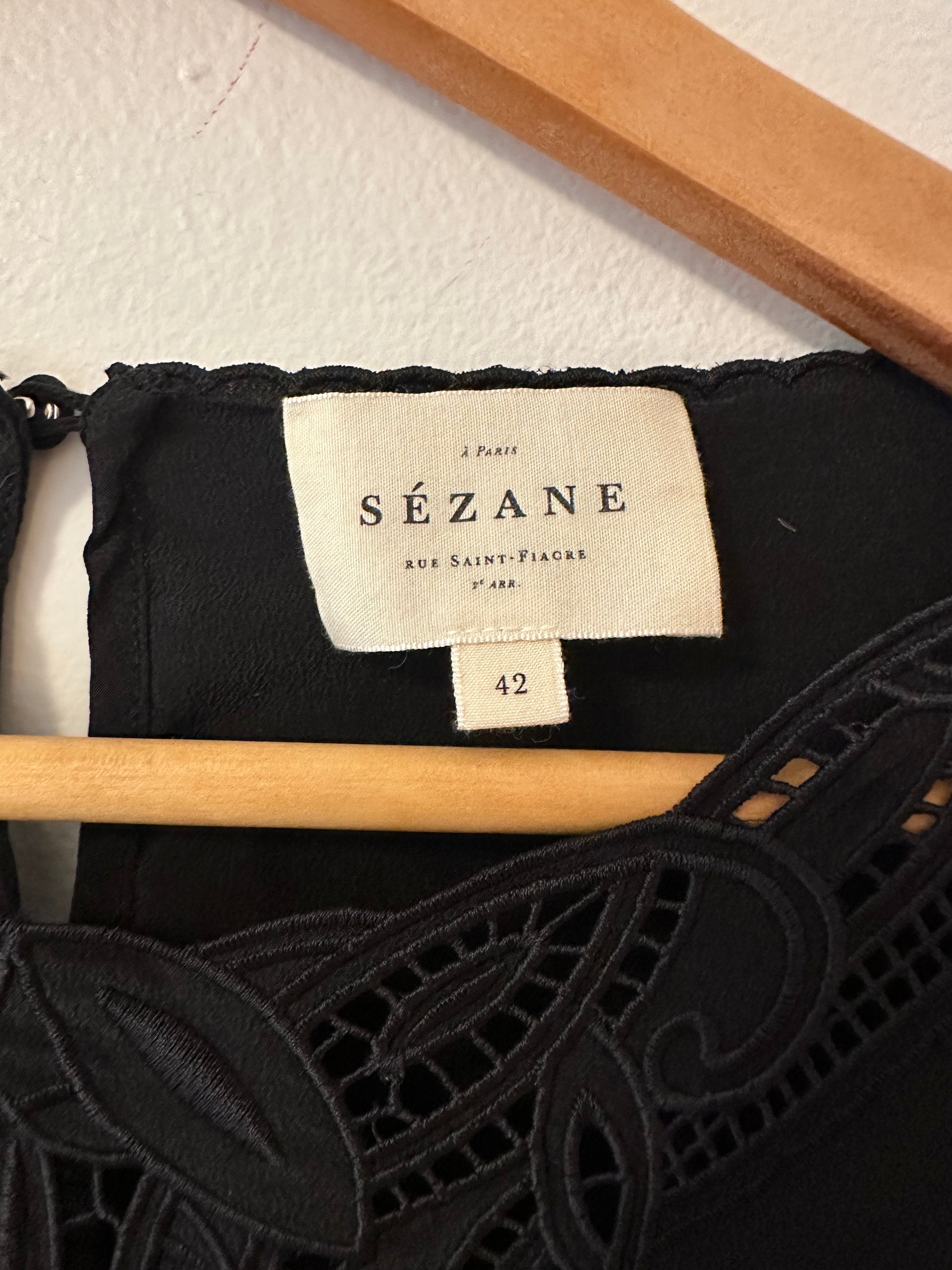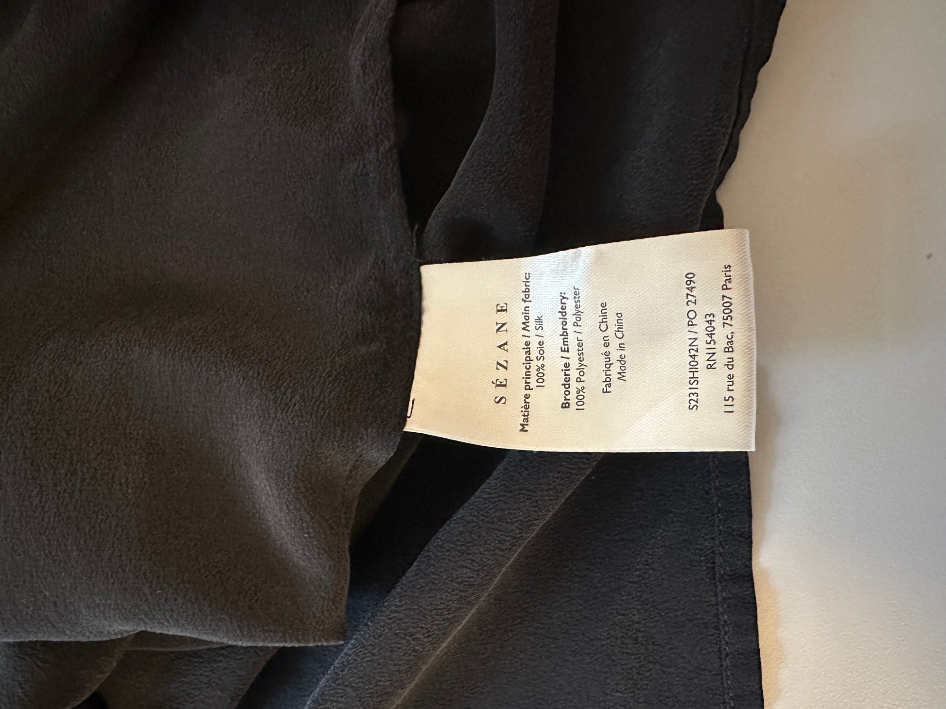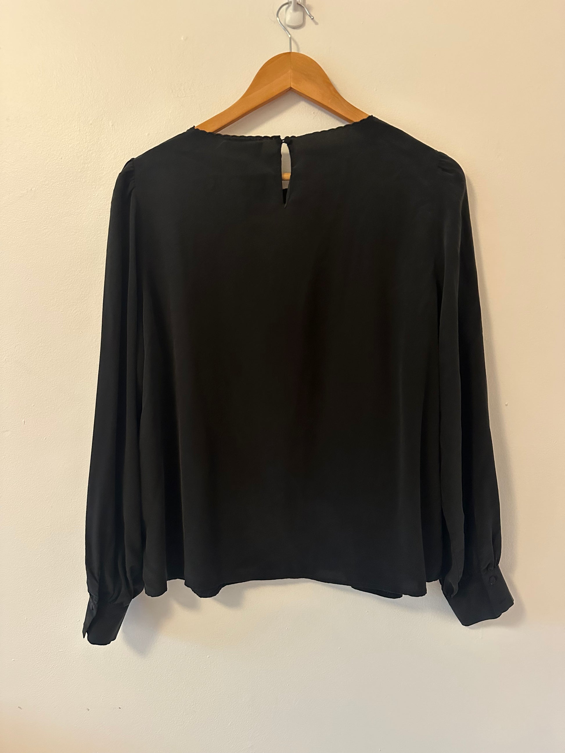 Sezane Carlotta Black Silk Blouse with Lace Neckline Accent | Size US 10 / EU 42