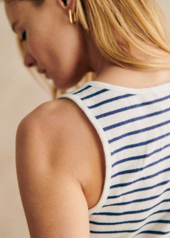Cotton and linen tank top with a round neck and slightly curved hem.
