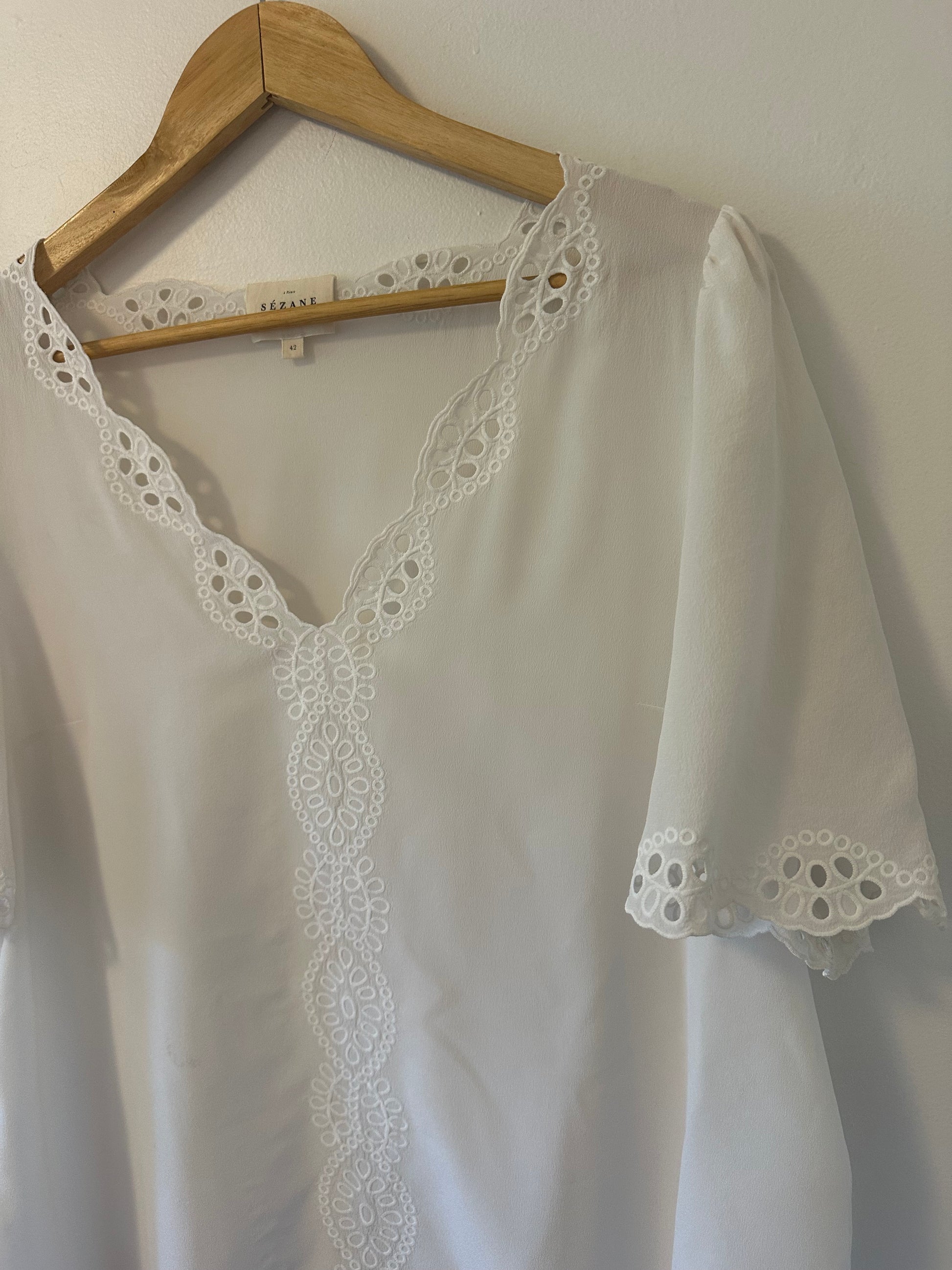 Sezane White Lace Trim Silk Blouse | Size 10 EU 42