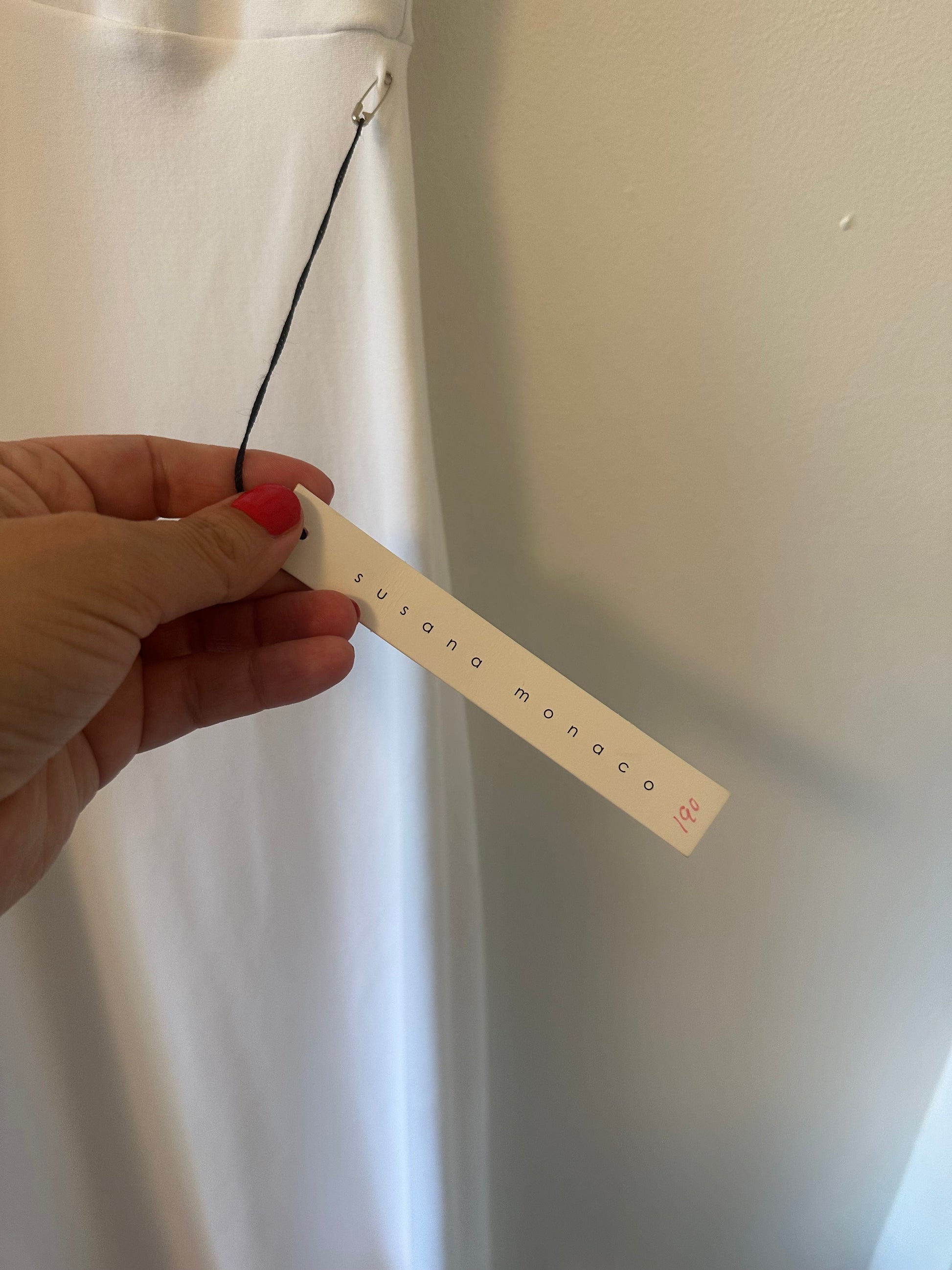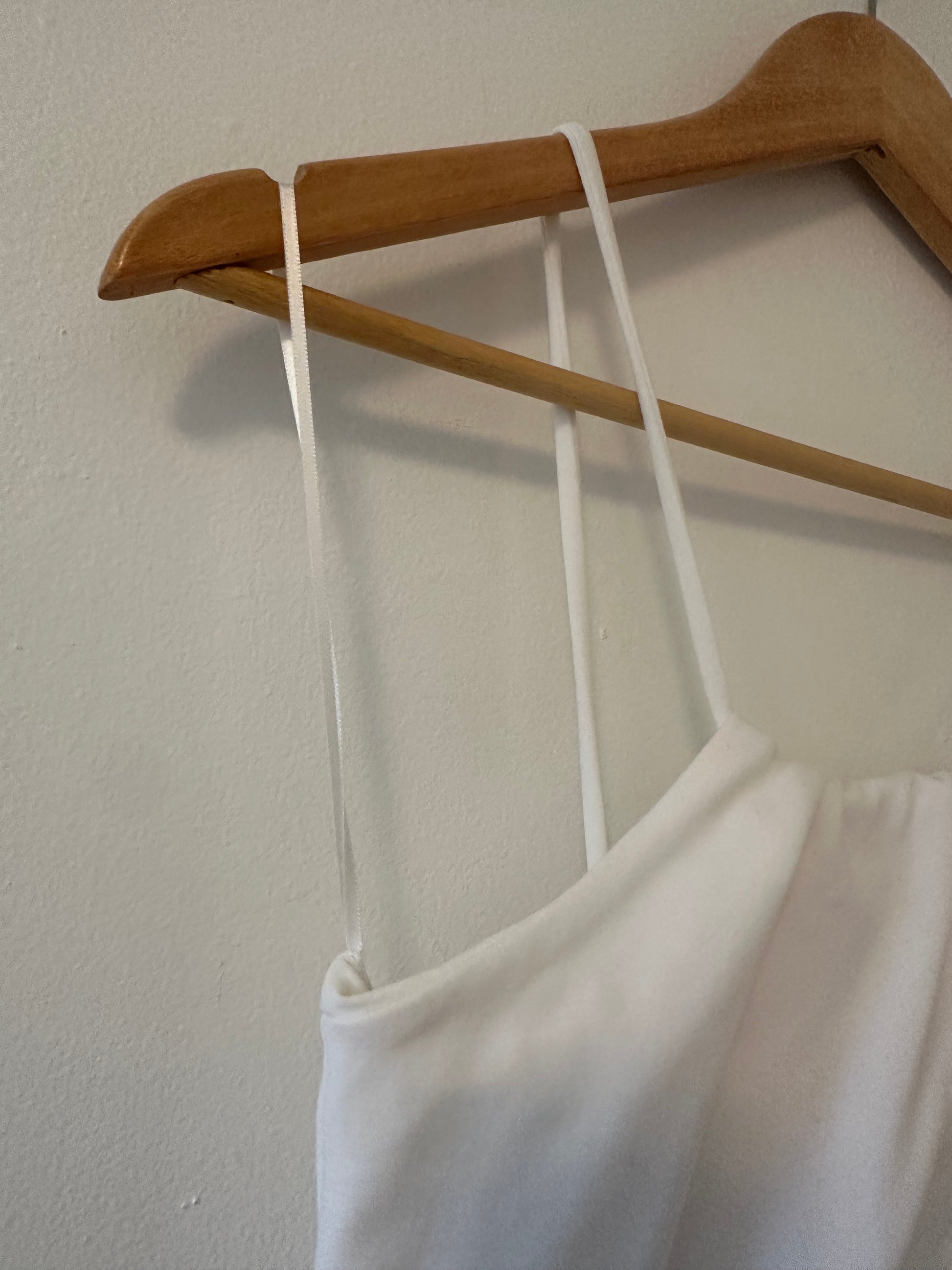 Twist front with spaghetti straps - the side straps shown while on the hanger are just the hanger straps.