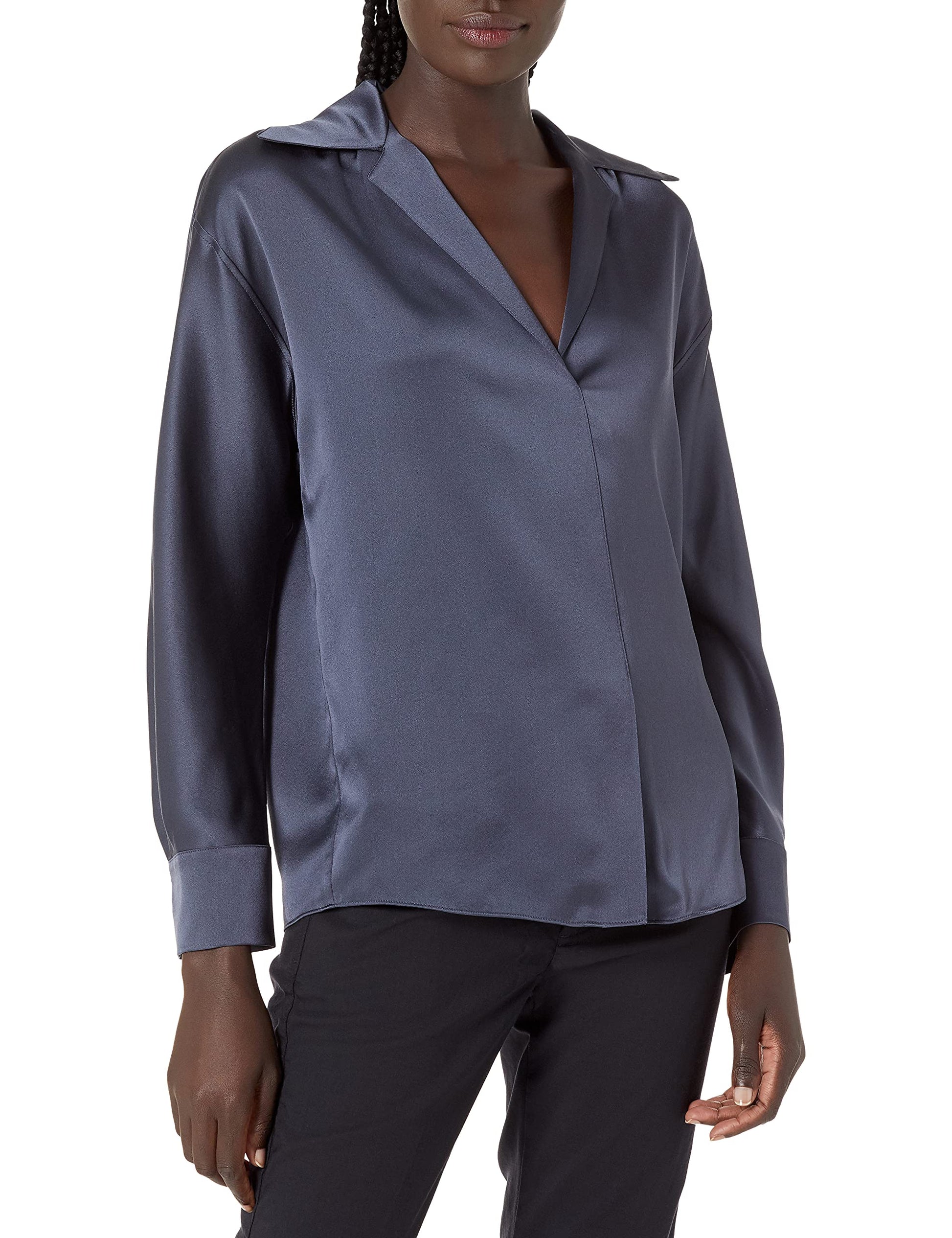 Vince Long Sleeve Shaped Collar Silk Pullover Blouse in Dark Water - Size Medium